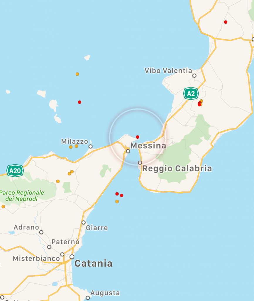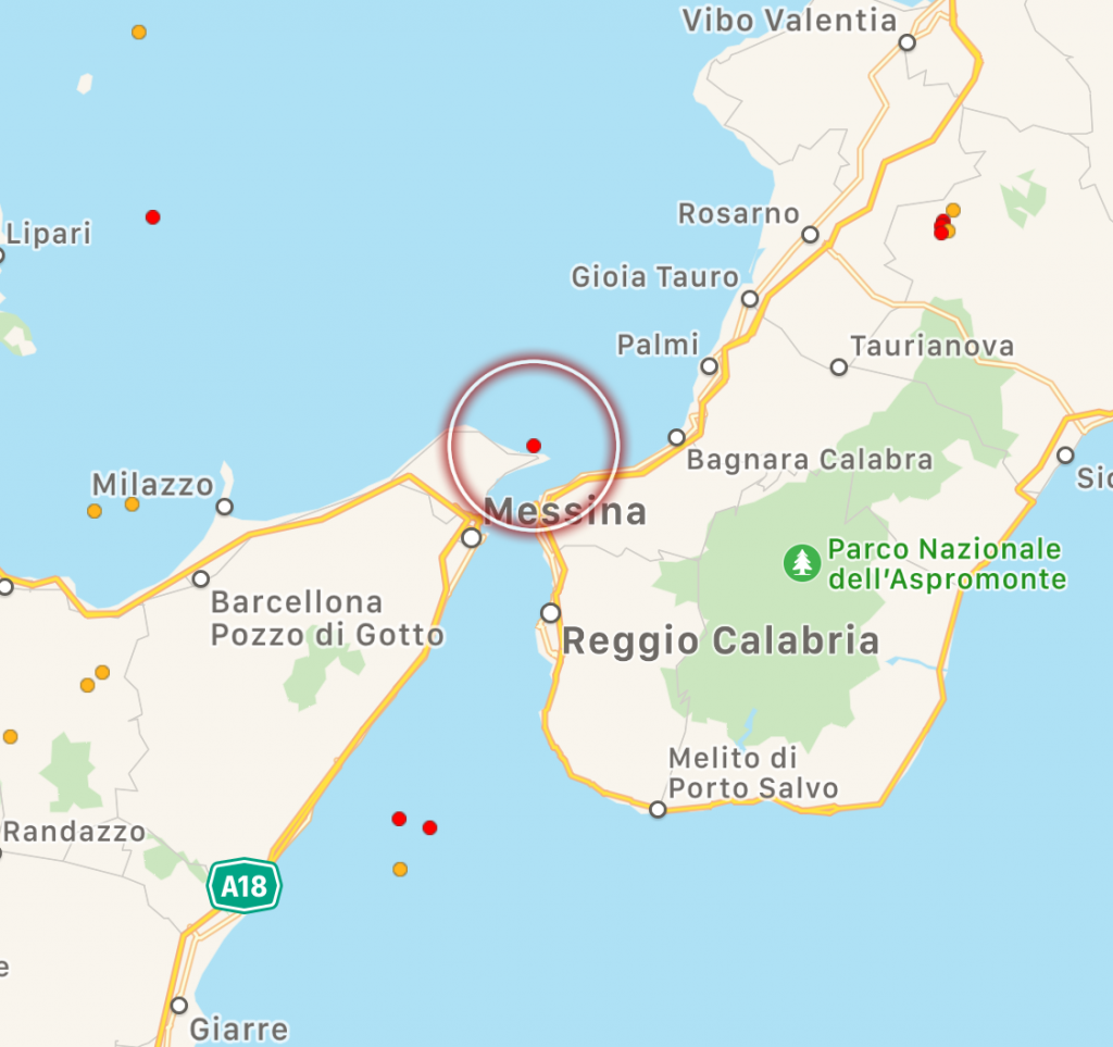 Una scossa di terremoto di magnitudo 2.9 ha interessato l’area dello Stretto di Messina pochi minuti fa, alle 16:32 di oggi pomeriggio. La scossa s’è verificata a 70km di profondità. L’epicentro è stato localizzato nelle acque del basso Tirreno al largo di Mortelle, nella zona di Ganzirri. Da giorni lo Stretto è abbastanza irrequieto, con numerose scosse e uno sciame sismico un paio di giorni fa.
