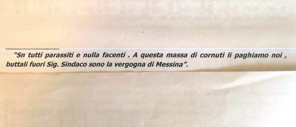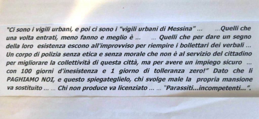 La Sezione di Polizia Giudiziaria della Polizia Municipale di Messina ha denunciato tre leoni da tastiera responsabili del reato previsto dall’art. 595 c.p. (diffamazione aggravata). Ecco in allegato i volgari epiteti rivolti agli agenti della Polizia.