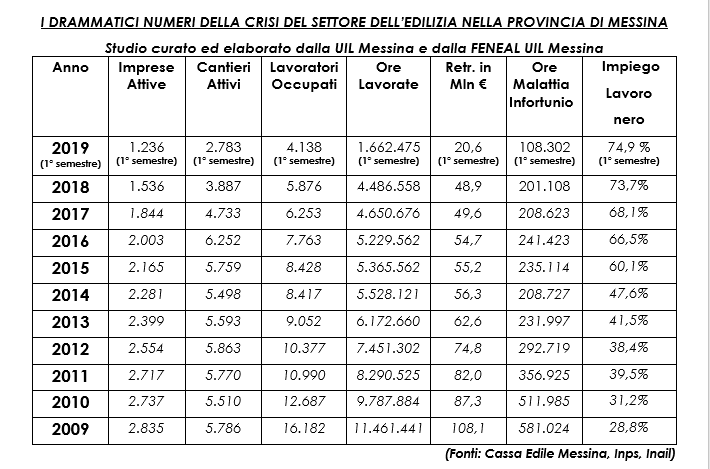 10 anni a confronto, anche quest’anno, come da consueta tradizione di Ferragosto, la Uil Messina e la Feneal Uil presentano, al fine di compiere un’analisi approfondita, i drammatici dati relativi al letterale disfacimento del settore dell’edilizia, un comparto che è stato il principale volàno per l’economia dell’intera provincia messinese. “La diffusione e pubblicizzazione di questo complesso e certosino studio effettuato dalla Uil Messina e dalla Feneal Uil, basato su un’articolata elaborazione di dati certi derivanti dall’incrocio dei numeri ufficiali provenienti dalla Cassa Edile, dall’Inps e dall’Inail, rappresenta l’occasione per lanciare, con la forza dei paurosi numeri negativi che lo caratterizzano, l’ennesimo appello, ormai forse inutile, finalizzato ad evitare la definitiva cancellazione del settore dell’edilizia e per evidenziare le cause che, senza se e senza ma, vedono un’evidente pesante corresponsabilità del governo nazionale (oggi in piena crisi), del governo regionale guidato da Musumeci e delle amministrazioni comunale e metropolitana guidate dal sindaco di Messina De Luca”. Si legge in una nota.
