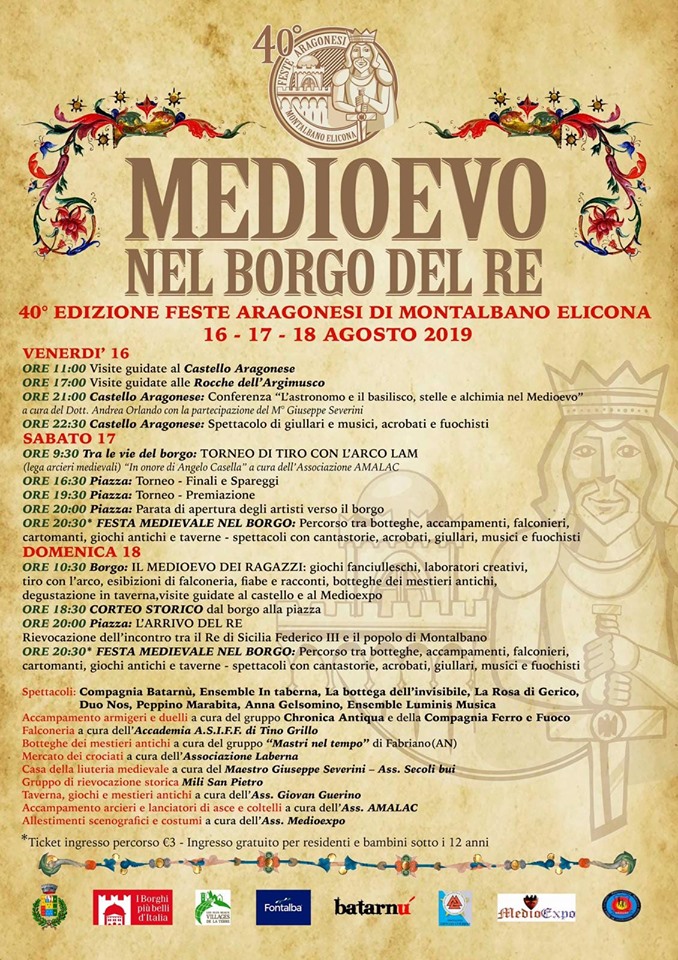 Fervono i preparativi al Borgo di Montalbano Elicona (Messina) per la 40ª edizione de le “Feste Aragonesi e Corteo Storico”, organizzata dall’Amministrazione Comunale. Dopo il suggestivo video promozionale che lascia intravedere una ventata di qualità e novità nella manifestazione, sulla pagina ufficiale Montalbano Elicona – Borgo dei Borghi è stato pubblicato da qualche giorno anche il ricchissimo programma.