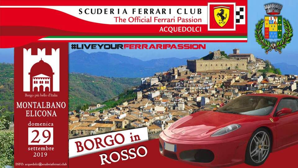 Ed anche domenica prossima, 29 settembre sarà un’imperdibile occasione per visitare Montalbano. Il paese nebroideo si vestirà del rosso italiano più apprezzato al mondo grazie alla prestigiosa manifestazione “Borgo in Rosso”, che avrà inizio alle ore 11 con la sfilata delle magnifiche Ferrari della “Scuderia Ferrari Club” di Acquedolci e successiva sosta in Piazza SS. Maria della Provvidenza. Questo esclusivo mix di bellezza tra il Borgo più bello d’Italia e l’Auto più bella in assoluto come ulteriore ed importante attrattiva per i visitatori. Il rombo dei motori non si fermerà per tutta la giornata anche per la spettacolare prova del campionato regionale di Enduro organizzata dal Motoclub La Potenza per la quale è prevista grande partecipazione.