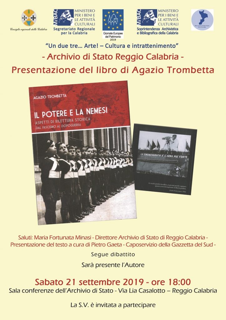 In occasione delle Giornate Europee del Patrimonio 2019, l’Archivio di Stato di Reggio Calabria presenta il libro di Agazio Trombetta “Il potere e la nemesi. Aspetti di rilettura storica dal Fascismo al Dopoguerra”. L’evento ha ricevuto il patrocinio del Consiglio Regionale della Calabria, del Segretariato Regionale Mibac per la Calabria, della Soprintendenza Archivistica e Bibliografica della Calabria e della Deputazione di Storia Patria per la Calabria. Il libro sarà presentato dal giornalista Piero Gaeta, caposervizio del quotidiano Gazzetta del Sud. Interverranno la prof. Carmelina Sicari ed il prof. Antonino Monorchio. Sarà presente l’autore che, in quest’ultima sua opera, attraverso fonti archivistiche anche inedite sia civili che militari, rivisita, integra e approfondisce l’analisi storica di vicende relative alla Seconda Guerra mondiale, con particolare attenzione al territorio calabrese e reggino. Con l’apporto di documenti non più secretati, provenienti da archivi nazionali e internazionali si delinea il progressivo coinvolgimento dell’area reggina nel fronte marittimo meridionale.