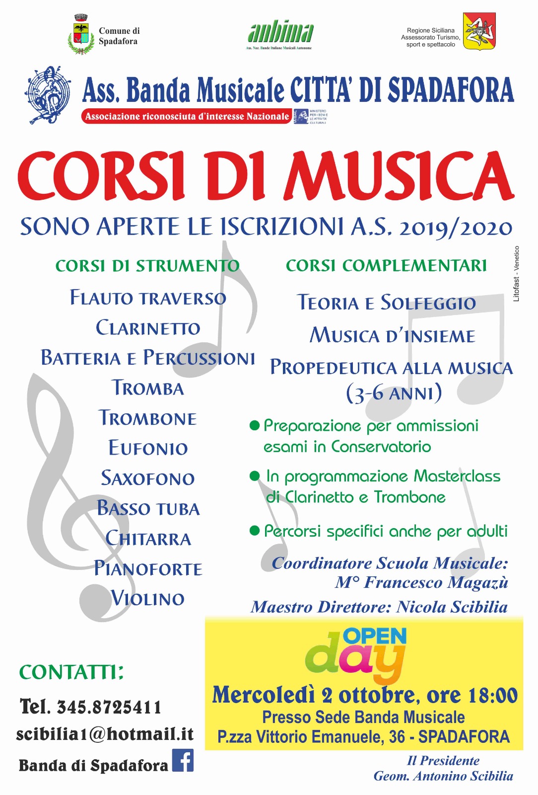Il 2 ottobre alle ore 18,00 sarà presentata alla cittadinanza la vetrina della scuola musicale della Banda Città di Spadafora retta dal geom. Nino Scibilia, coordinata dal Maestro Francesco Magazù, direttore è il Maestro Nicola Scibilia, piena di novità e di un ampia offerta formativa con docenti di spiccata professionalità. Gli strumenti proposti vanno dagli ottoni (basso, Eufonio, tromba, trombone, ecc.) alle ance ( clarinetto, sassofono, ecc.), percussioni (tamburo, cassa, piatti, batteria) Che sono strumenti prettamente bandistici, ma anche chitarra classica, pianoforte e violino.