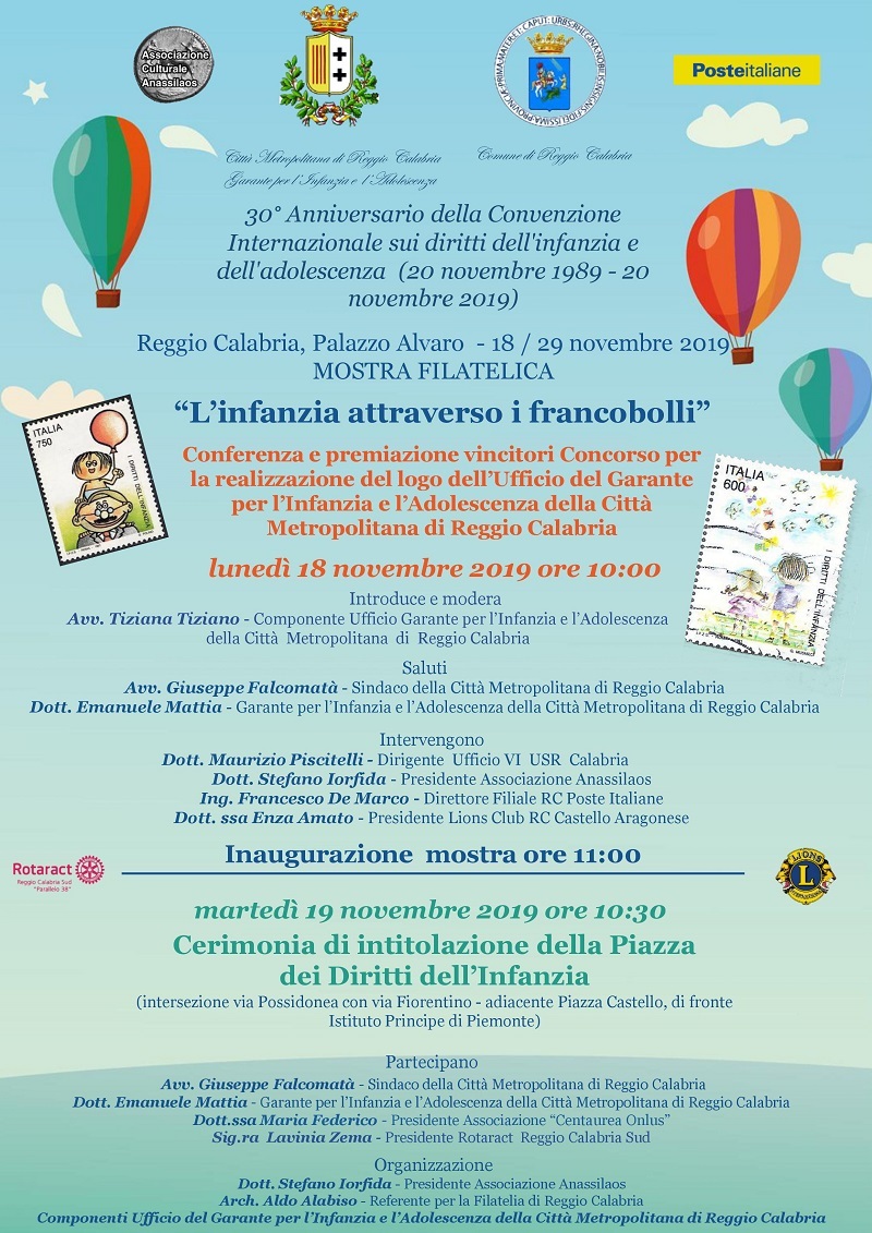 Si svolgerà oggi alle ore 10:30 a Reggio Calabria la cerimonia di intitolazione della Piazza dei Diritti dell’Infanzia all’intersezione di via Possidonea con via Fiorentino, adiacente Piazza Castello, di fronte l’Istituto Principe di Piemonte. All’evento partecipano: il sindaco Falcomatà, Emanuele Mattia, Garante per l’infanzia e l’adolescenza della Città Metropolitana, Maria Federico, presidente dell’Associazione “Centaurea Onlus”, Lavinia Zema, presidente del Rotaract Reggio Calabria Sud.