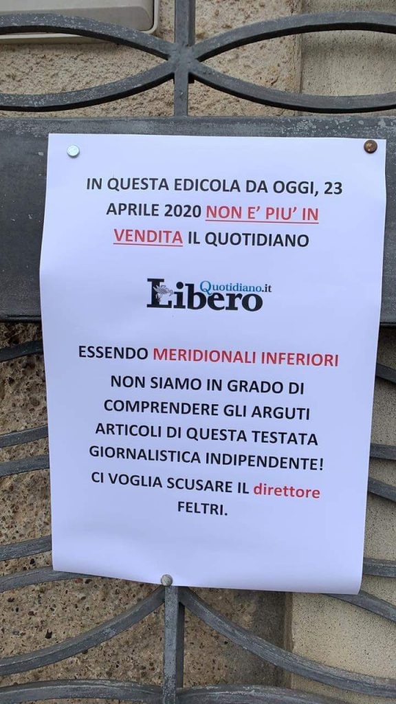 Dopo le parole polemiche di Vittorio Feltri, direttore di Libero, che ha lanciato pesanti accuse al popolo meridionale, si stanno moltiplicano in queste ore le iniziative di edicolanti e librai in Calabria e in Sicilia che si rifiutano di vendere il quotidiano del giornalista bergamasco. Dopo aver riportato la scelta della storica Libreria Ave di Reggio Calabria, che ha annunciato di aver restituito alla casa editrice i libri di Feltri, si apprende che una situazione molto simile si sta verificando a Montalto Uffugo. Nel paese in provincia di Cosenza, la signora Tiziana Marchese, titolare di una libreria, ha affisso un volantino e su Facebook ha affermato: “mi permetto di scrivere direttamente poiché sentir parlare il ‘Dottor’ Vittorio Feltri di noi del SUD utilizzando certi termini è scandaloso. Con tutto il rispetto per la libertà di stampa e di opinione, mi pare che qui si tratta di un atteggiamento razzista proclamato da un personaggio pubblico molto influente. Sono una piccola libraia affiliata al gruppo Mondadori con sede a Milano, città accogliente e laboriosa, ma arricchita da tanti meridionali che hanno sempre collaborato a questa crescita. Tanti gli studenti meridionali che studiano nelle varie università, tante presenze che coppano posti di prestigio in Lombardia e contribuiscono alla crescita stessa. Essendo la mia libreria anche edicola, da oggi informerò i miei clienti, gente del sud e non solo, che il giornale ‘Libero’ non sarà più venduto, perché non è giusto arricchire gente che non ci porta rispetto”. Lo stesso è avvenuto in un’edicola di Trapani, dove non sarà più in vendita il quotidiano. Il tutto ufficializzato attraverso un biglietto che recita ironicamente: “In Questa Edicola, da oggi non è più in vendita il quotidiano “Libero”. Essendo meridionali inferiori non siamo in grado di comprendere gli arguti articoli di questa testata giornalistica indipendente! Ci voglia scusare il direttore Feltri”.