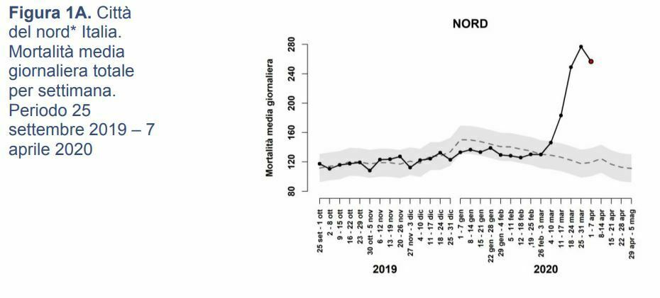 “La Figura 1A e 1B e Figura 2A e B mostrano l’andamento della mortalità settimanale per tutte le età e per le classi di età (65-74, 75-84, 85+) aggiornata al 7 aprile 2020 separatamente per le città del nord e del centro-sud. Nelle città del nord si rileva, a partire dall’inizio di marzo, l’incremento della mortalità per tutte le classi di età, mente nelle città del centro-sud l’incremento, più contenuto, a partire da metà marzo, interessa soprattutto le classi di età 75-84 e 85+ anni. Il grafico mostra nelle ultime tre settimane una flessione del fenomeno che interessa soprattutto la classe di età 75-84 anni (figura 1b, 2b, 3)”.