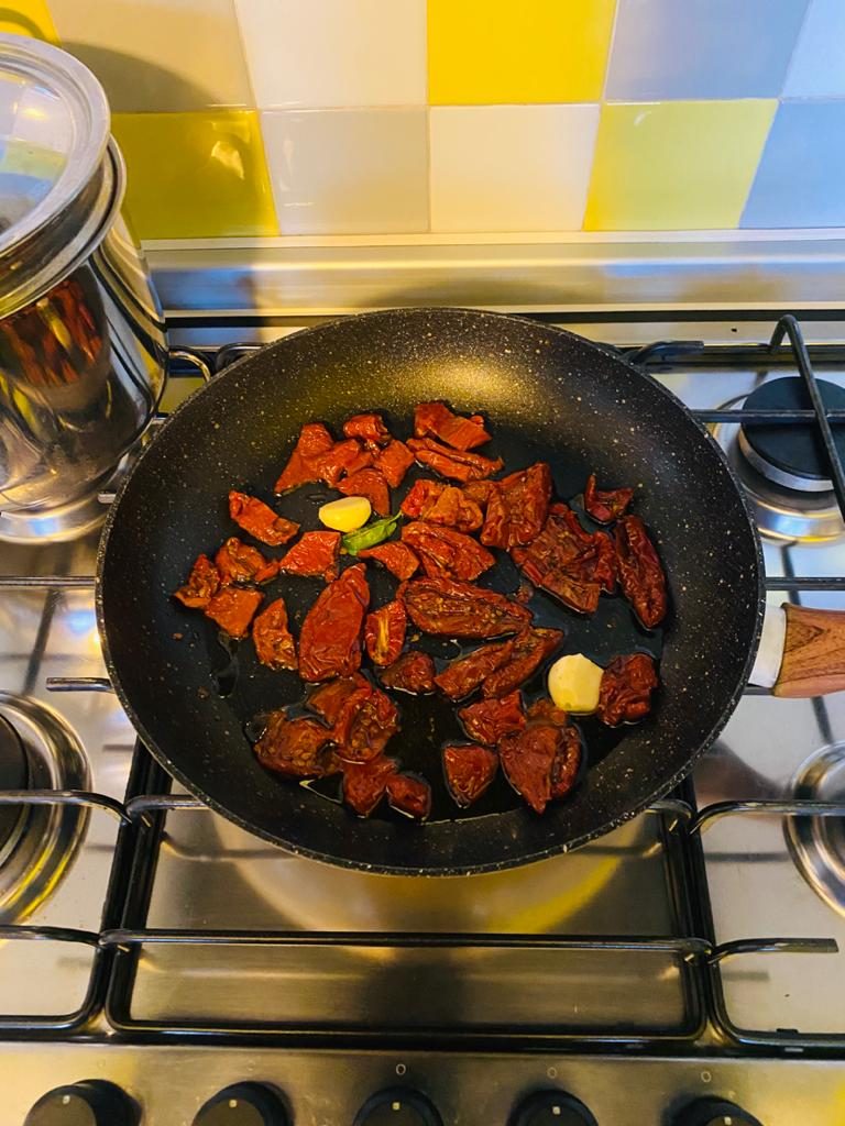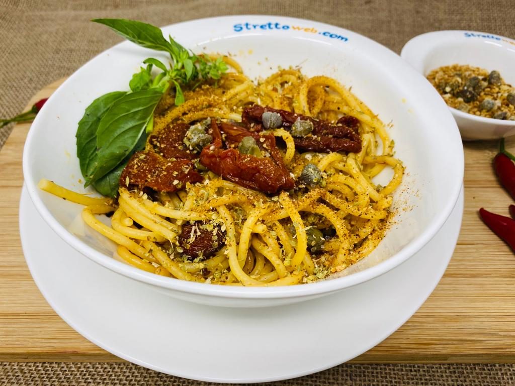 La pasta ai pomodori sott’olio è un primo piatto della cucina tradizionale calabrese gustosissimo ma anche di estrema facilità ed a basso costo. I pomodori secchi sott’olio sono una tipica conserva realizzata dalle nostre nonne la cui preparazione consiste in una essiccazione lenta al sole dei pomodori, alla fine dell’estate, che perdono la loro acqua ed acquistano un sapore intenso. Una volta pronti possono essere consumati durante tutto l ‘inverno in vari modi, come antipasto, serviti con del pane casereccio, per dare un gusto deciso alle insalate o, come oggi, per cucinare un primo veloce ma molto stuzzicante.