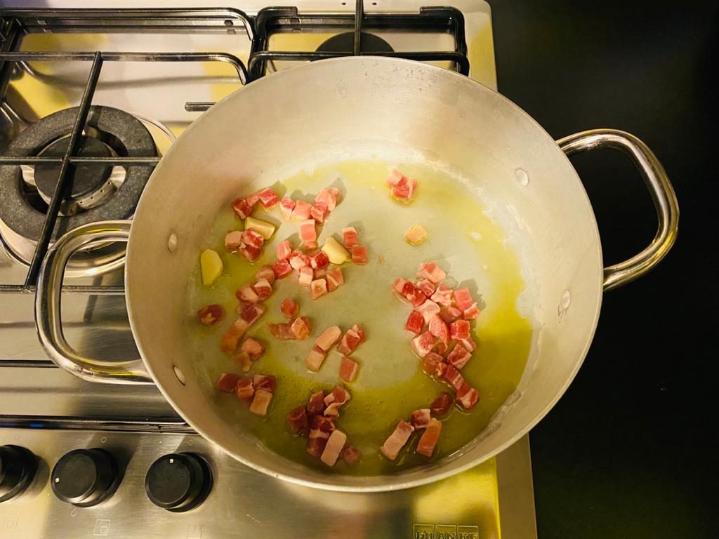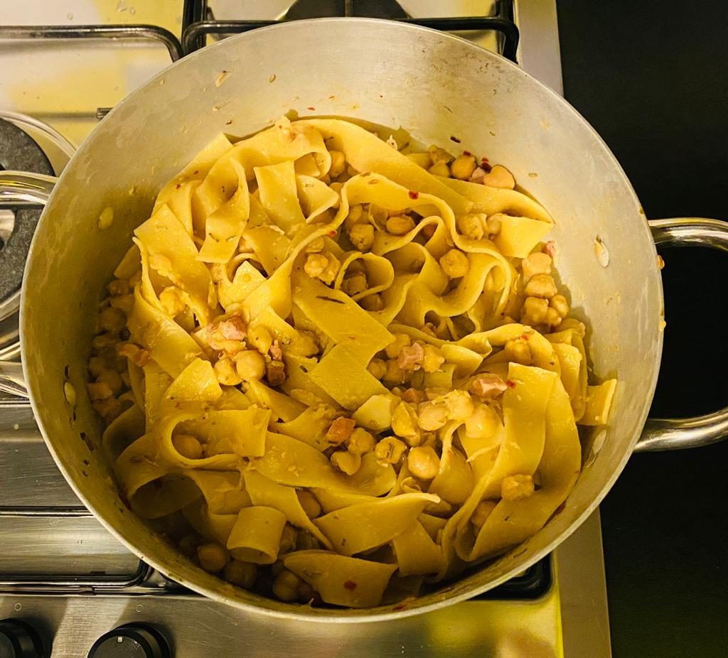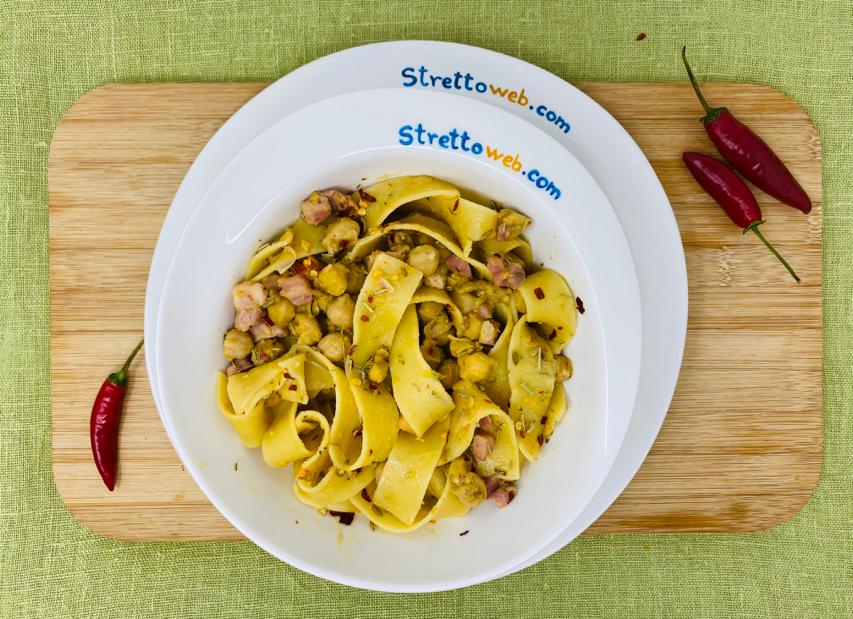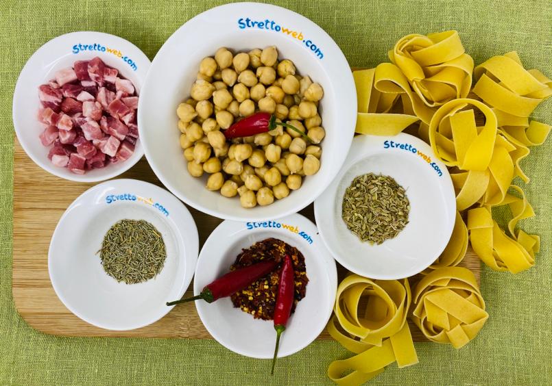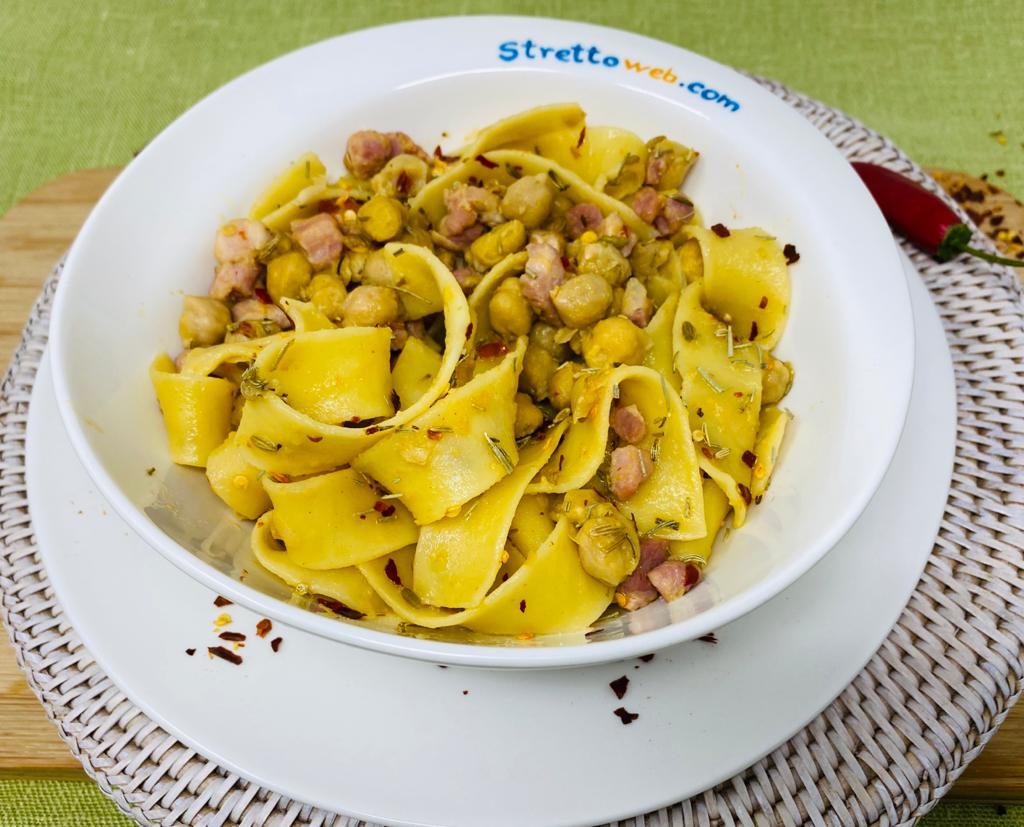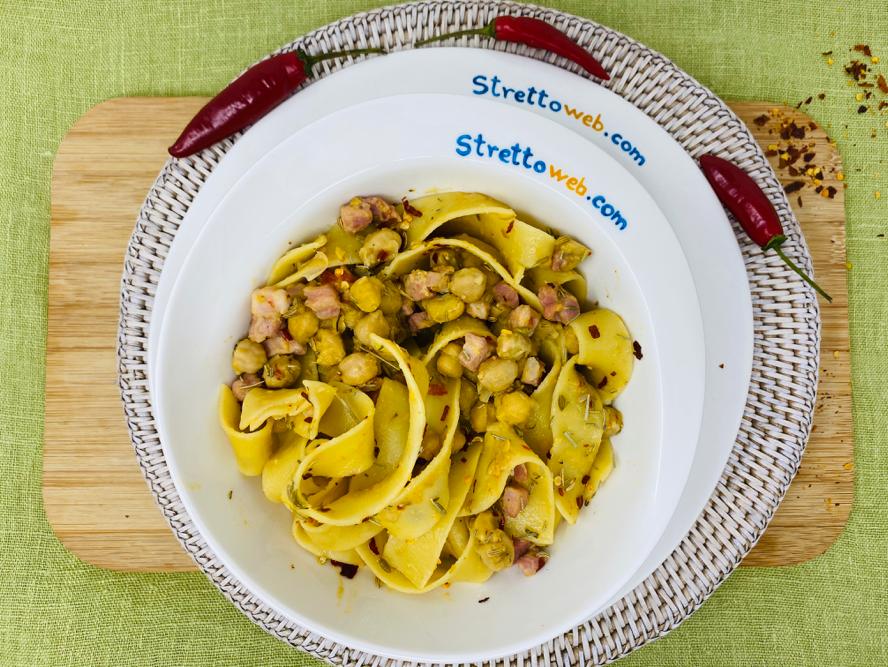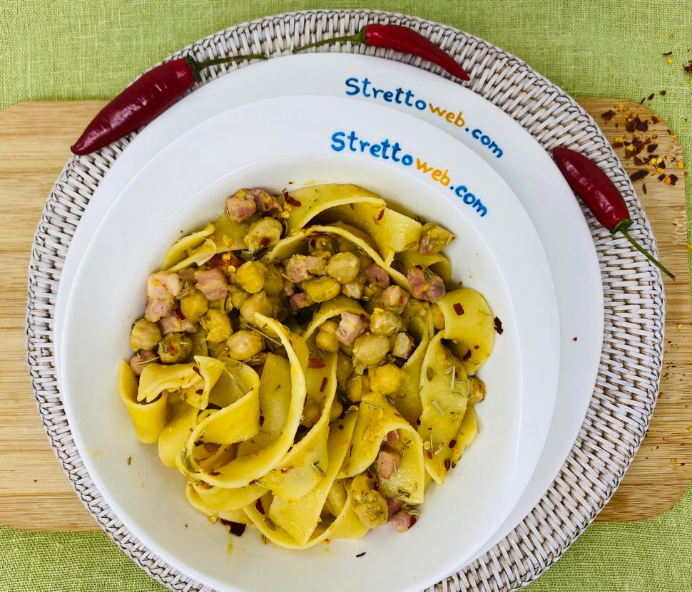 Occorre davvero poco tempo: se usiamo le tagliatelle secche, prima di metterle a bollire, vanno spezzettate e cotte al dente, l’acqua di cottura va conservata. Mentre l’acqua bolle, rosoliamo in padella la pancetta affumicata con poco olio d’oliva e uno spicchio d’aglio; aggiungiamo i ceci precotti dopo averli sciacquati, i semini di finocchietto, il rosmarino e del peperoncino. Lasciamo insaporire i ceci con la pancetta, usando un po’ di acqua di cottura della pasta. Trasferiamo la pasta al dente nella padella con i ceci, aggiungiamo ancora un po’ di acqua di cottura della pasta e lasciamo cuocere qualche minuto. Serviamola calda con una spolverata di peperoncino secco ed un filo di olio d’oliva.