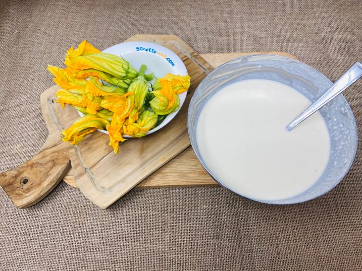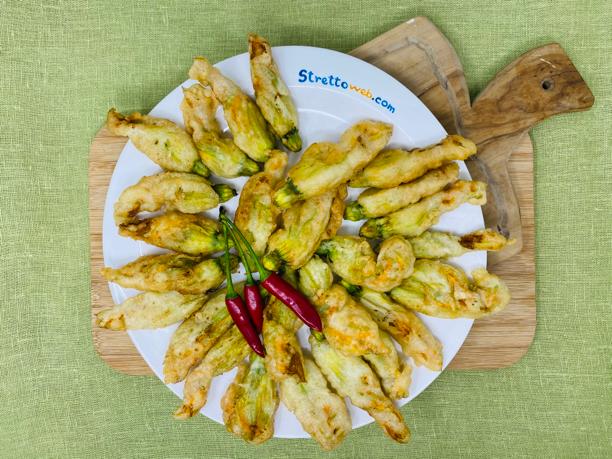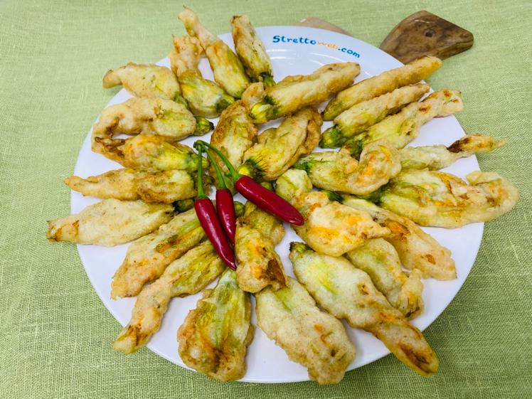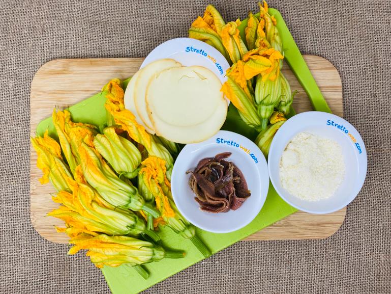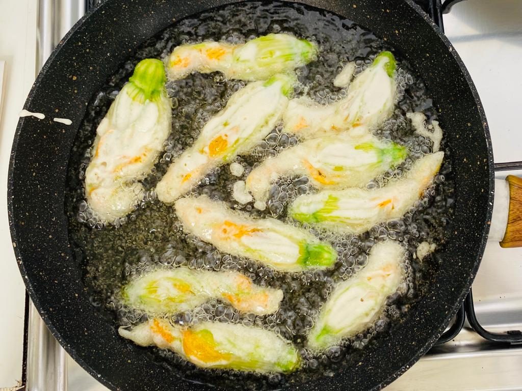Lavate delicatamente i fiori, accorciate il gambo e metteteli a scolare. Preparate la pastella mescolando in una terrina alta l’acqua, un pizzico di sale, la farina ed il formaggio grattugiato; la pastella deve risultare densa e deve riposare per un’ora circa. Farcite i fiori con una strisciolina di provola e una acciuga sottile e immergeteli nella pastella fredda prima e poi nell’olio bollente. In padella girateli una volta quando una parte è già dorata e salate soltanto alla fine. Inutile dire che vanno mangiate appena fritte e caldissime.