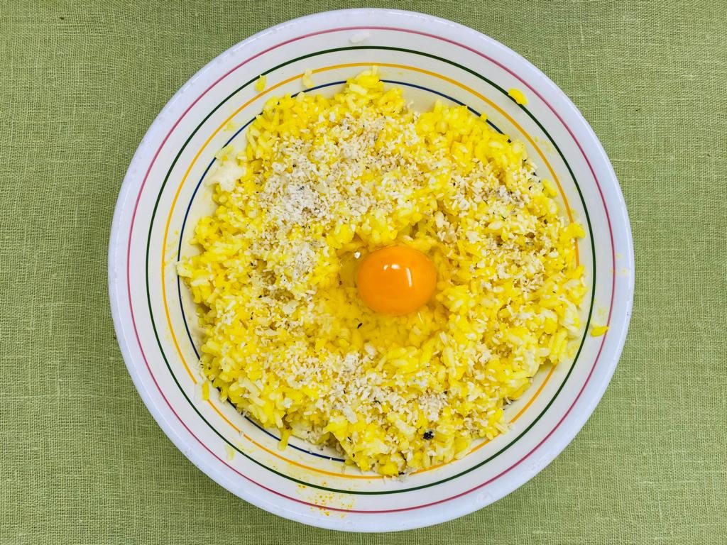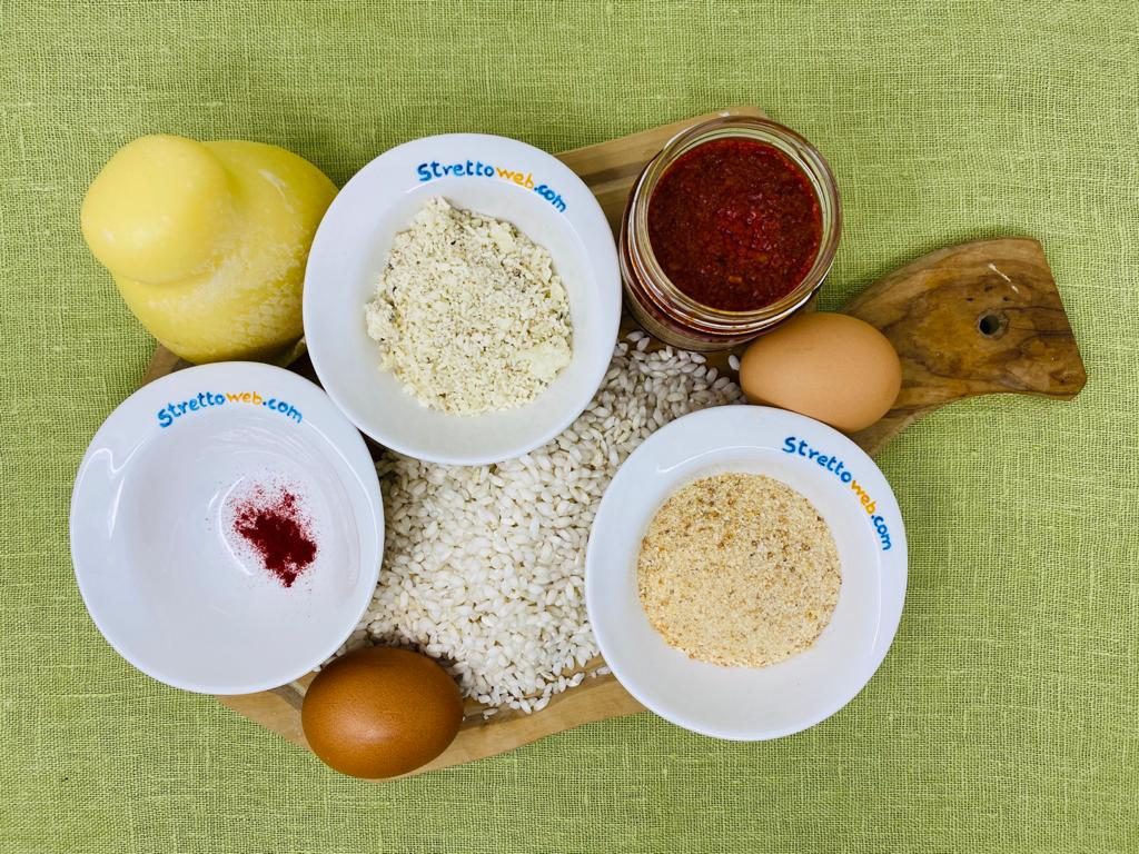 Portate ad ebollizione l’acqua, salate e aggiungete il riso, coprite e fate cuocere a fuoco moderato. A fine cottura il riso dovrà aver assorbito completamente l’acqua della pentola. A riso ancora caldo mantecatelo con lo zafferano sciolto in acqua, un uovo, il pecorino grattugiato ed il burro mescolando tutto. Fate raffreddare. Successivamente formate con il composto palle di circa 5 cm di diametro. Fate con il pollice un buco in ciascuno, riempitelo con una piccola quantità di ‘nduja e alcuni dadini di provola e poi chiudetelo. Passate gli arancini nella farina, poi nelle uova sbattute e salate, quindi nel pangrattato. Friggeteli in olio ben caldo.