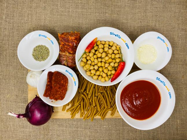 La fileja, o gli scialatielli, sono dei maccheroni che venivano fatti in casa dalle nostre nonne e poi conditi con il ragù di capra, con i ceci, ma anche con un sugo di alici, pomodoro, mollica e capperi. Altro ingrediente tipicamente calabrese di questa ricetta è la nduja, un salame cremoso e molto piccante che forse deriva da una specialità francese, “Andouille”, giunta in Italia nel 1800. Anche la soppressata DOP di Calabria fa parte del menu odierno, è un diffuso insaccato calabrese, molto saporito e piccante, spesso accompagnato dal pane casereccio e da un buon bicchiere di vino rosso. La cipolla di Tropea, o oro rosso di Calabria, la cui dolcezza è dovuta ai terreni di questa zona ed al suo microclima particolare, si abbina in questo piatto alle altre specialità che raccontano la nostra regione.