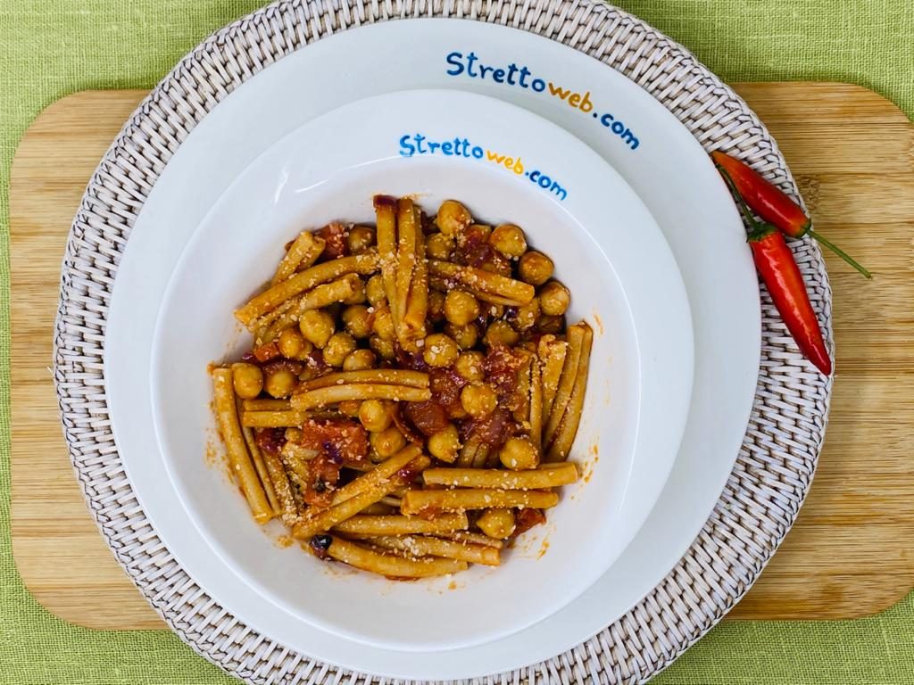 Lessate i ceci, dopo averli lasciati a bagno una notte, insieme ad un rametto di rosmarino e ad uno spicchio d’aglio e conservate l’acqua di cottura. Se volete preparare la fileja in casa seguite la ricetta tradizionale ma è possibile acquistarla. Mettete a rosolare in padella, a fuoco basso, la cipolla con l’olio e la soppressata tagliata a pezzettini, versate il pomodoro e cuocete per 15 minuti, adesso aggiungete la nduja e mescolate per farla sciogliere, cuocete per 15 minuti ancora. Schiacciate una parte di ceci per ottenere una crema e unitela al sugo insieme alla parte restante di ceci e tenete in caldo. Cuocete la pasta e versatela nel sugo aggiungendo acqua di cottura dei ceci se dovesse rimanere asciutta. Spolverate il pecorino grattugiato e buon appetito!