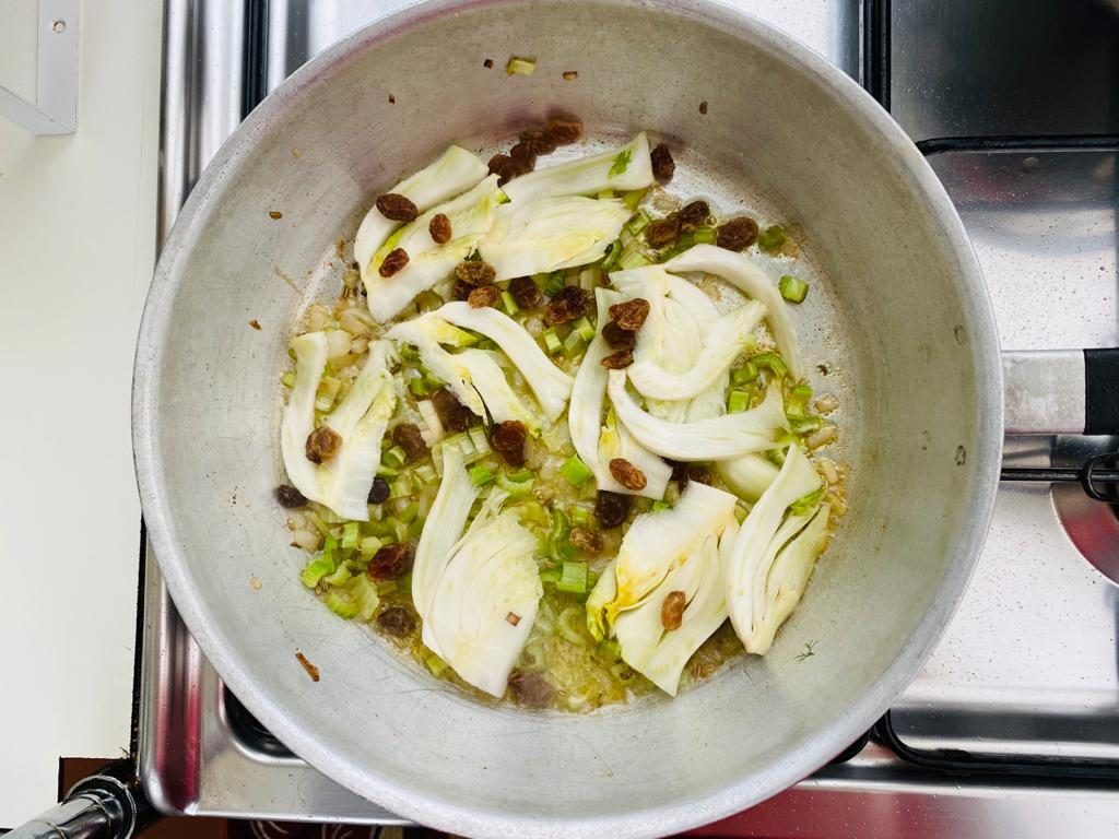 Pulite i finocchi, lavateli e tagliateli a spicchi sottili. Pulite il sedano e la cipolla e tritateli finemente. Mettete l’uvetta ad ammorbidire in acqua fredda. Lavate i filetti di sardine e lasciateli scolare. Ponete una padella sul fuoco con 4 cucchiai di olio, aggiungete l’aglio, il sedano, la cipolla, i semi di finocchio e lasciate rosolare tutto a fiamma bassa. Unite le fettine di finocchio, mescolate e, appena saranno colorite, bagnate con il vino bianco. Dopo che questo sarà evaporato aggiungete al sugo le sardine e l’uvetta. Insaporite con sale e pepe e fate cuocere ancora per 15 minuti. Lessate la pasta in abbondante acqua salata, scolatela al dente, trasferitela in padella e lasciatela per 2 minuti. Fate tostare il pangrattato e spolverate sulla pasta insieme al prezzemolo tritato e al pepe nero.