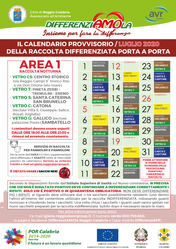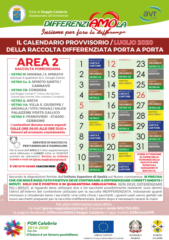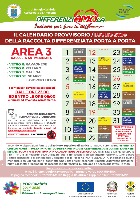 Pubblicati i calendari di raccolta differenziata porta a porta, per il mese di Luglio 2020, per le utenze domestiche del territorio comunale. I nuovi calendari, con le medesime frequenze di raccolta dei precedenti, contengono anche le disposizioni fornite dall’Istituto Superiore di Sanità sul Nuovo coronavirus, si precisa, infatti, che chi non è risultato positivo deve continuare a differenziare correttamente i rifiuti. Solo chi è positivo o in quarantena obbligatoria, non deve differenziare più i rifiuti, al riguardo, deve utilizzare due o tre sacchetti possibilmente resistenti, (uno dentro l’altro) all’interno del contenitore utilizzato per la raccolta indifferenziata, indossando guanti monouso e chiudendo bene i sacchetti. Una volta chiusi i sacchetti, i guanti usati vanno gettati nei nuovi sacchetti preparati per la raccolta indifferenziata. Subito dopo è necessario lavarsi le mani. I calendari saranno altresì pubblicati sulla pagina facebook del servizio DifferenziAMOla Reggio Calabria, sul sito istituzionale della Città di Reggio Calabria: http://www.reggiocal.it/on-line/Home.html e sull’app mobile dedicata al servizio “DifferenziAPP” (disponibile per smartphone e tablet – iOS e Android). Vi ringraziamo per la collaborazione. Ulteriori informazioni possono essere richieste all’indirizzo e-mail igiene.reggio@avrgroup.it, al numero verde 800.759.650 oppure consultando la pagina facebook DifferenziAMOla Reggio Calabria e l’App DifferenziAPP.
