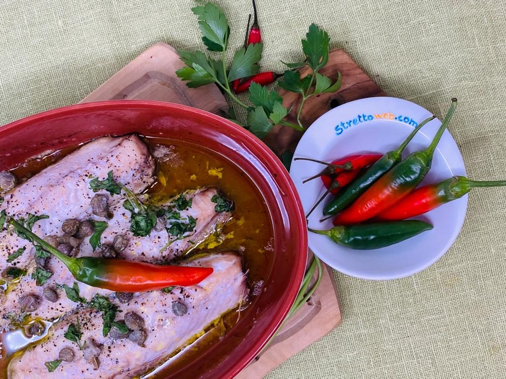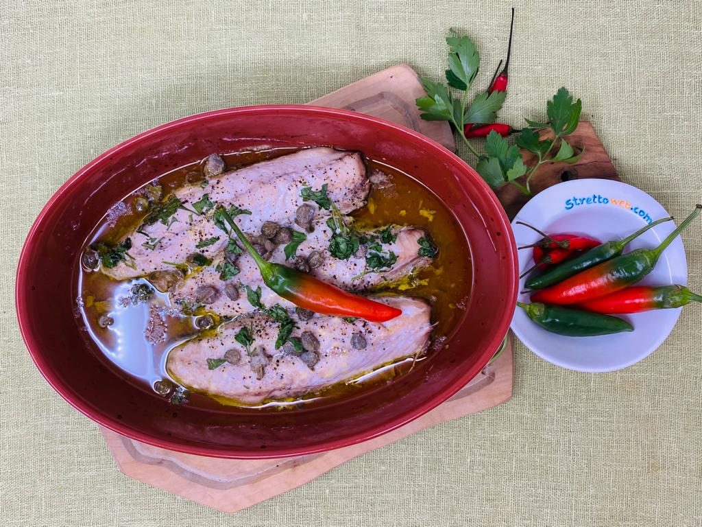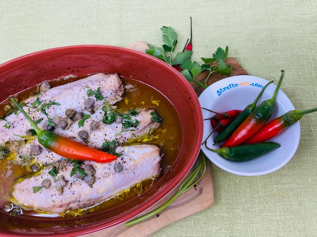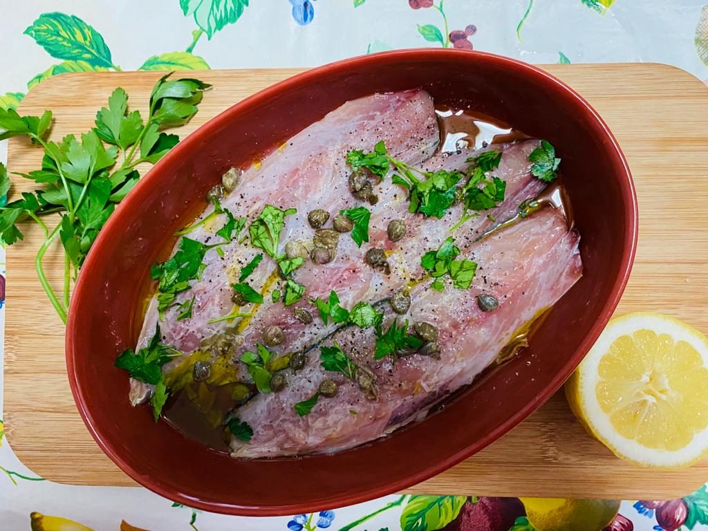 Versate in un tegame i filetti di alici spezzettati e l’olio e lasciate insaporire il condimento. Sistemate i pesci puliti nel tegame e aggiungete sale, pepe, il vino bianco, il succo di limone, il prezzemolo tritato ed i capperi. Fate cuocere in forno per circa 30 minuti bagnando il pesce con il sugo di cottura o, anche, con brodo di verdura.