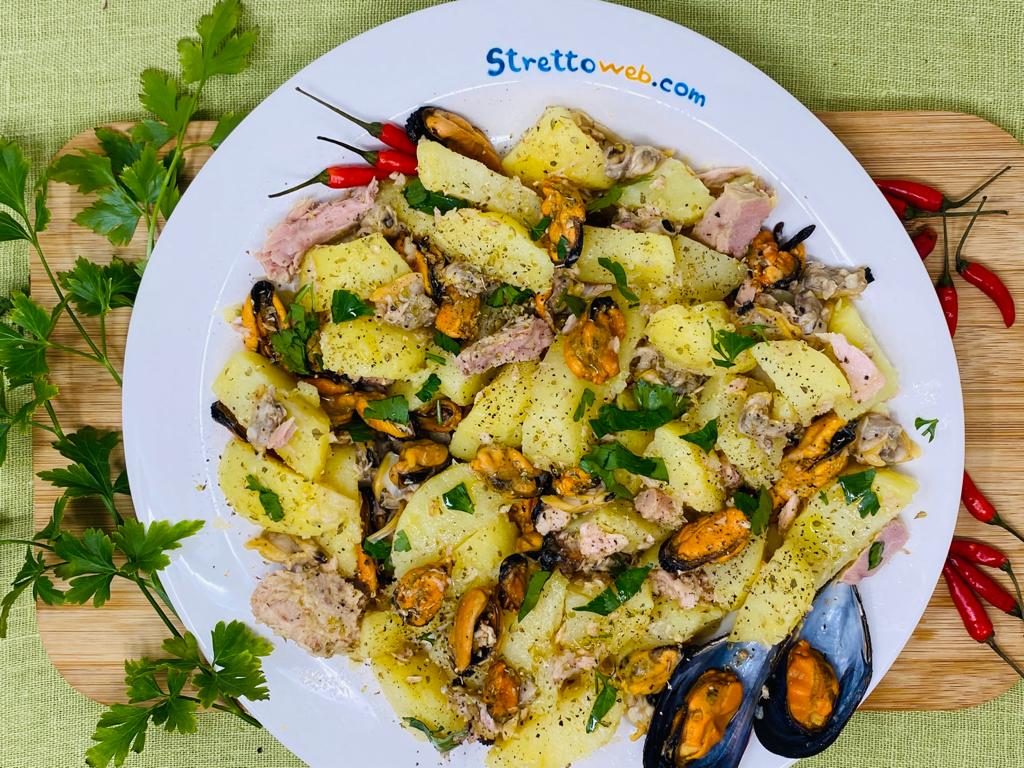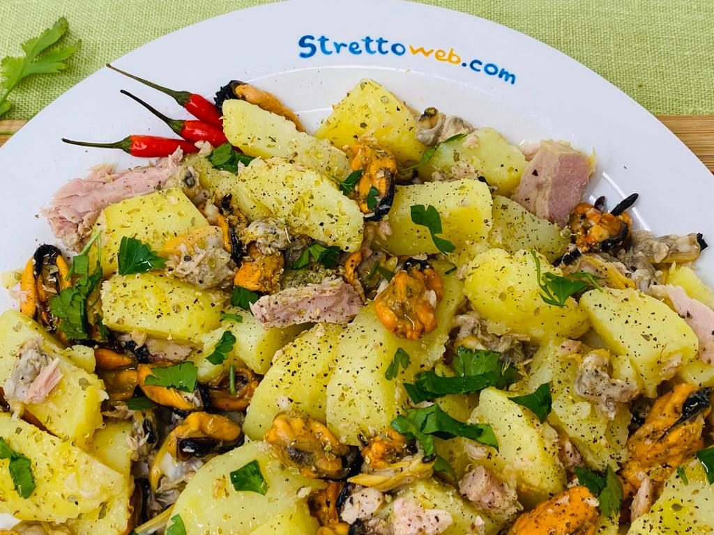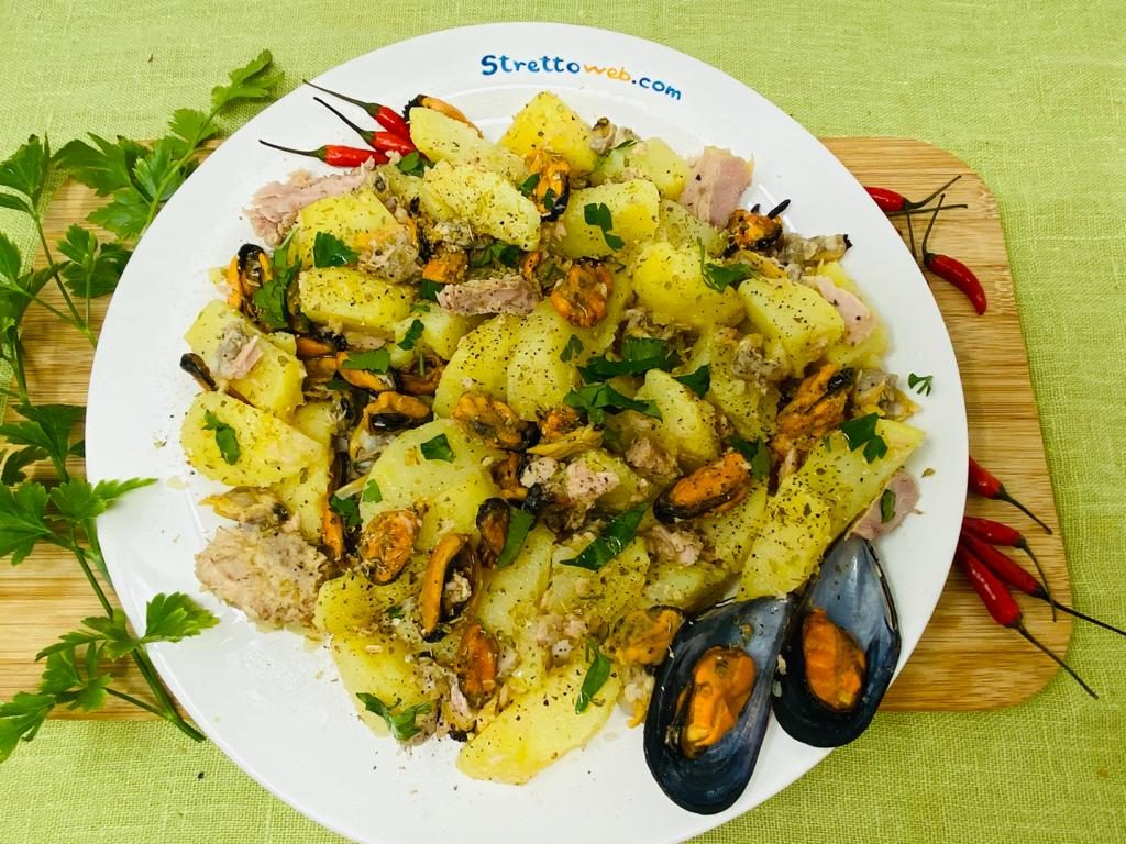 Lessate le patate in acqua fredda salata, pulite le cozze e lavatele bene sotto l’acqua corrente insieme alle vongole. Disponetele in una ampia padella e fatele aprire a fuoco vivo. Quando sono pronte sgusciatele e mettetele da parte. Pelate e tagliate le patate e unitele ai molluschi ed al tonno. Condite con olio e succo di limone, insaporite con pepe nero, prezzemolo ed aglio tritato e aggiungete anche un pizzico di origano. Mettete al fresco l’insalata prima di servire e buon appetito!!