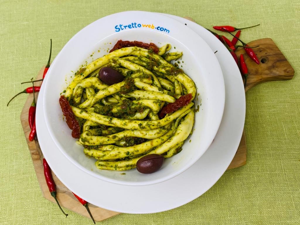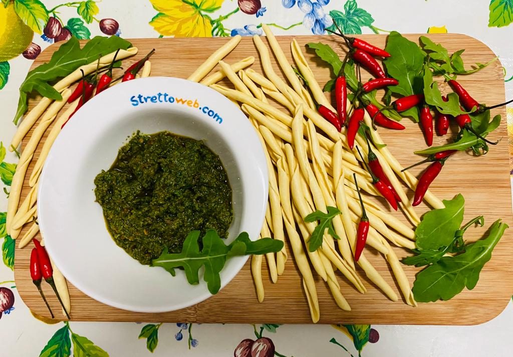 Il pesto di rucola con pomodorini sott’olio e alici è un condimento veloce da preparare ma molto saporito. I pomodori secchi, che si uniscono perfettamente alla rucola ed alle alici sott’olio, rievocano subito i sapori calabresi ed il calore del sole di questa terra.