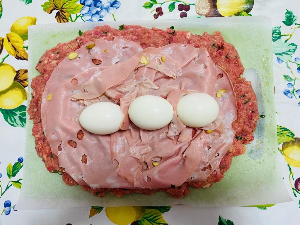 Il polpettone può essere cucinato anche in tegame con la salsa di pomodoro. In alternativa all’uovo sodo e alla mortadella sono ottime le verdure di stagione come spinaci, carote oppure zucchine.
