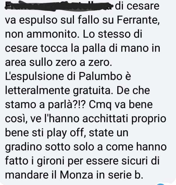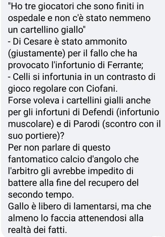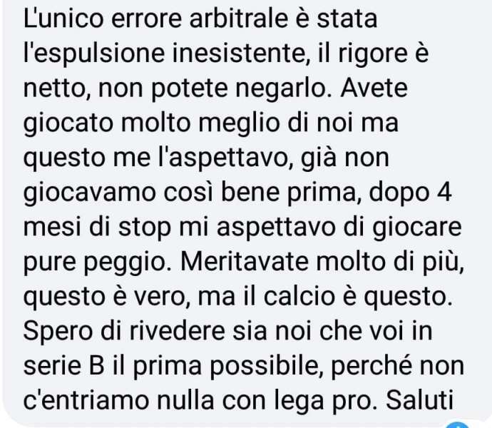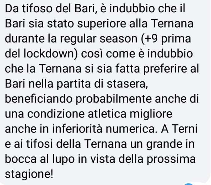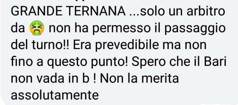 Sui social però non sono mancate le forti reazioni da parte dei tifosi. Quelli della Ternana, soprattutto, non sono riusciti a digerire l’eliminazione. Alcuni del Bari, invece hanno mostrato molta sportività e ammesso che qualche errore è stato commesso. “Arbitraggio scandaloso, a senso unico”, scrivono i sostenitori più imbufaliti. Tutte considerazioni da cui ovviamente la nostra redazione si dissocia, limitandosi a riportare alcuni di questi messaggi. Li riproponiamo nella FOTOGALLERY in alto.