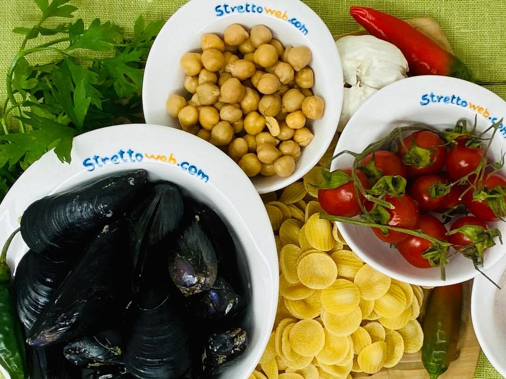 Per realizzare questo piatto potete mettere a bagno i ceci la sera e cuocerli la mattina seguente a fuoco lento oppure potete utilizzare quelli già pronti. Lavate le cozze e mettetele in padella con un filo d’olio, coprite e fatele aprire a fuoco vivo. Quando le cozze saranno aperte sgusciatele, filtrate l’acqua di cottura e rimettete le cozze dentro la loro acqua. Fate soffriggere un trito di prezzemolo, aglio, rosmarino e peperoncino e aggiungete i pomodorini tagliati a metà, o in quattro, ed i ceci. Versate l’acqua filtrata delle cozze e portate a bollore. In un’altra pentola cuocete le orecchiette scolandole due minuti prima direttamente nel condimento. Portate a termine la cottura e aggiungete anche le cozze, mescolando bene. Aggiungete un filo di olio extravergine di oliva ed una spolverata di prezzemolo. Servite!