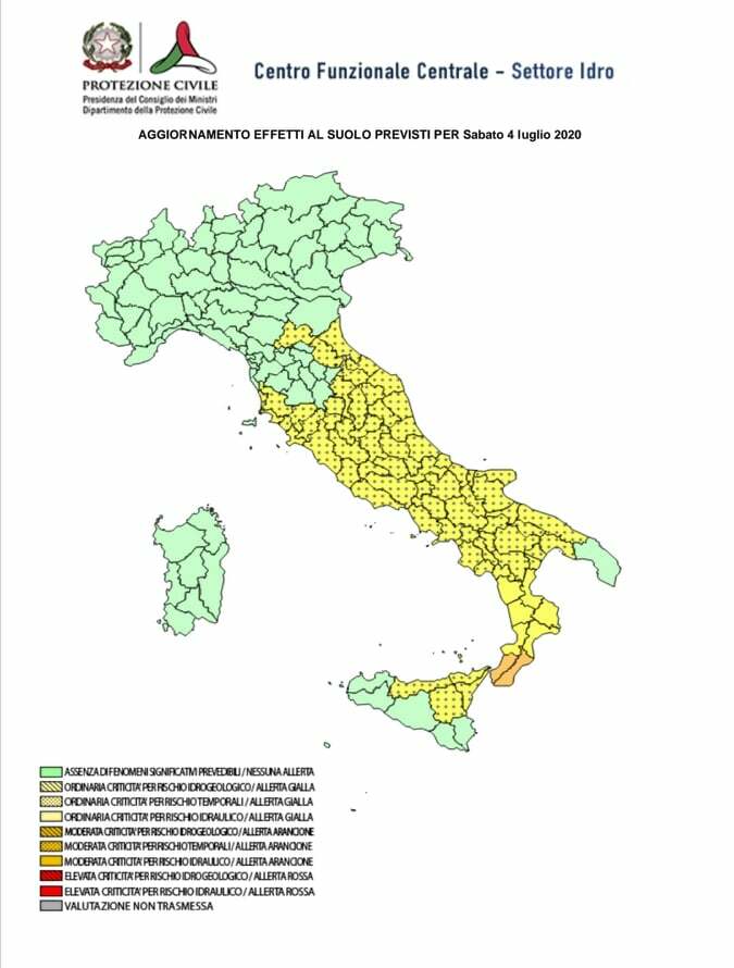 L’avviso prevede dal pomeriggio di oggi, sabato 4 luglio, precipitazioni, a prevalente carattere di rovescio o temporale, sulla Sicilia, specie sui relativi settori nord-orientali. I fenomeni saranno accompagnati da rovesci di forte intensità, frequente attività elettrica, grandinate e forti raffiche di vento. Sulla base dei fenomeni previsti e in atto è stata valutata per le giornate di oggi, sabato 4 luglio, e domani, domenica 5 luglio, allerta arancione sui versanti ionico e tirrenico meridionali della Calabria. Per la giornata di domani valutata, inoltre, allerta gialla sul restante territorio della Calabria e su settori della Basilicata e della Sicilia. Il quadro meteorologico e delle criticità previste sull’Italia è aggiornato quotidianamente in base alle nuove previsioni e all’evolversi dei fenomeni, ed è disponibile sul sito del Dipartimento della Protezione Civile (www.protezionecivile.gov.it), insieme alle norme generali di comportamento da tenere in caso di maltempo. Le informazioni sui livelli di allerta regionali, sulle criticità specifiche che potrebbero riguardare i singoli territori e sulle azioni di prevenzione adottate sono gestite dalle strutture territoriali di protezione civile, in contatto con le quali il Dipartimento seguirà l’evolversi della situazione.