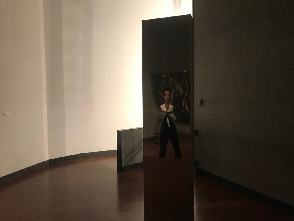 Tra gli artisti presenti anche Edoardo Dionea che ispirato dalle scienze ed in particolare dal tema dei buchi neri, propone un’installazione che richiama il tema della distorsione del tempo e dello spazio, quindi della realtà stessa. Questa, il cui titolo è “XYZT.SP”, si presenta come una struttura autoportante in metallo con una superficie specchiante sul fronte. La superficie dello specchio, dritta e nitida, presenta una particolarità: a tratti riflette la realtà, appunto, distorcendola attraverso un gioco di riflessi, anche con i dipinti di Caravaggio presenti nella sala dov’è esposta e grazie ai quali l’artista crea un dialogo tra presente e passato, tornando al tema del tempo. Infatti, ad intermittenza, gli specchi distorcono la realtà riflessa e gli osservatori “spariscono” in un flusso dinamico che prima gli consente di “fondersi” con lo spazio circostante e con i dipinti stessi, per poi essere “sputati fuori” dall’opera. Riprendendo alcune delle teorie relative a quanto possa accadere alla materia che entra all’interno dell’orizzonte degli eventi di un buco nero.