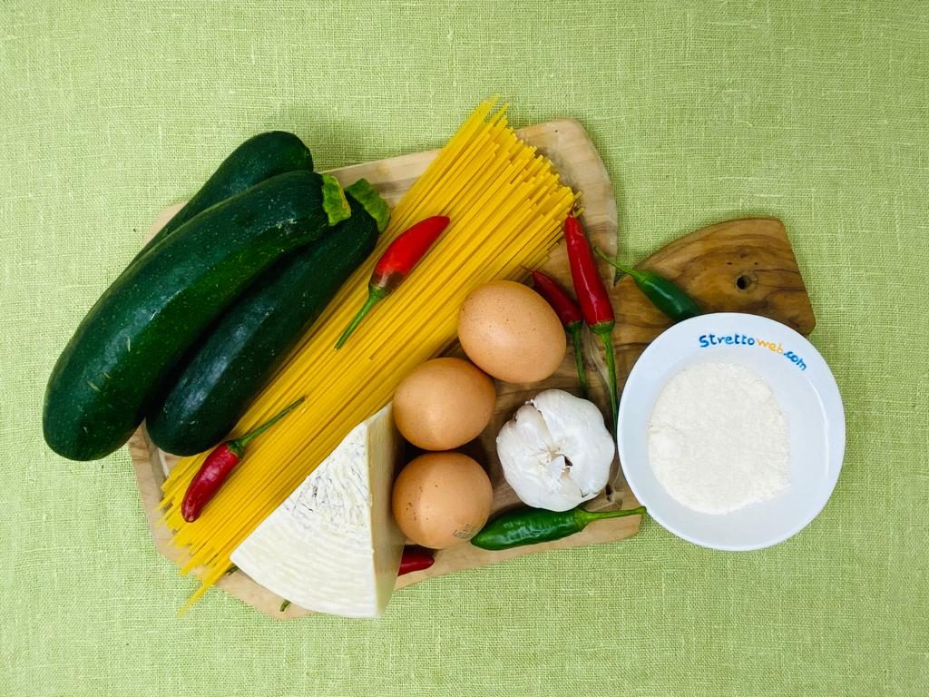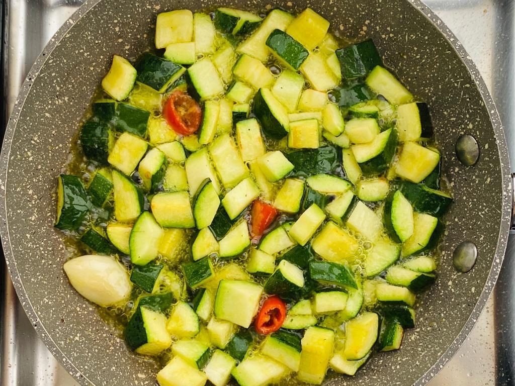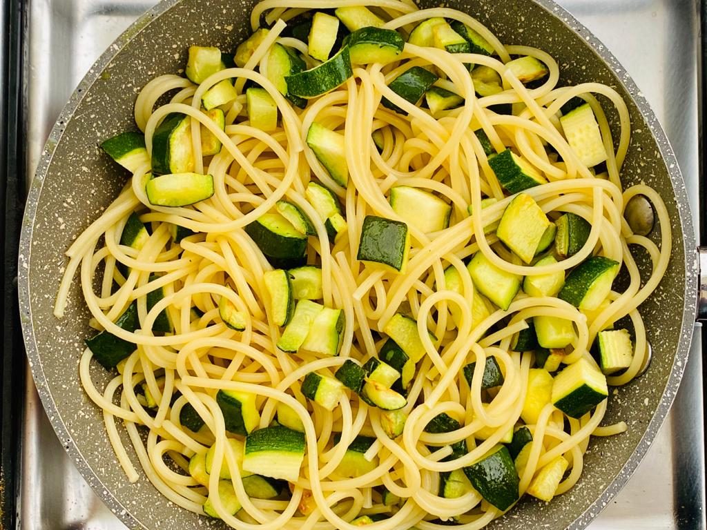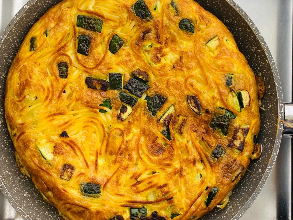Iniziate lavando e tagliando a cubetti le zucchine; fatele cuocere pochi minuti in padella con un filo d’olio, un pizzico di sale, aglio e peperoncino. Cuocete al dente gli spaghetti, scolateli e fateli raffreddare. Uniteli alle zucchine amalgamando bene. In una ciotola sbattete le uova e aggiungete il formaggio, il sale ed il pepe. Tagliate a cubetti il pecorino e unitelo alle uova. Versate il composto sulla pasta e fate cuocere a fiamma bassa per 10 minuti col coperchio, adesso girate la frittata per cuocerla anche dall’altro lato per circa 5 minuti. La frittata di spaghetti si gusta sia calda che fredda.