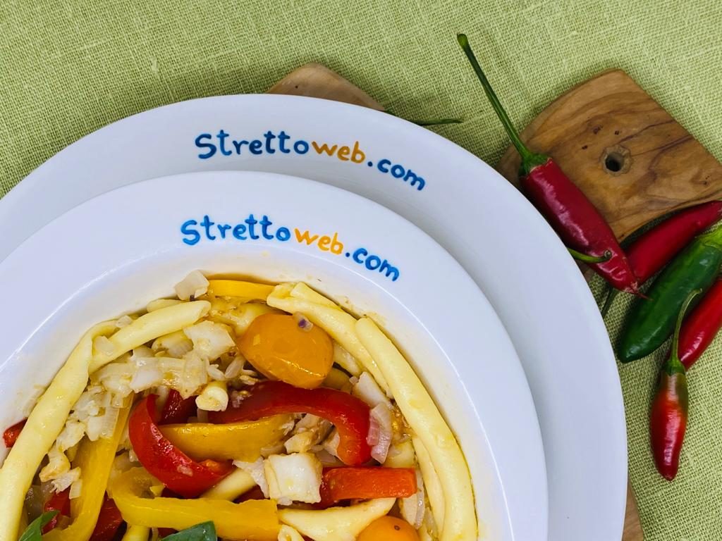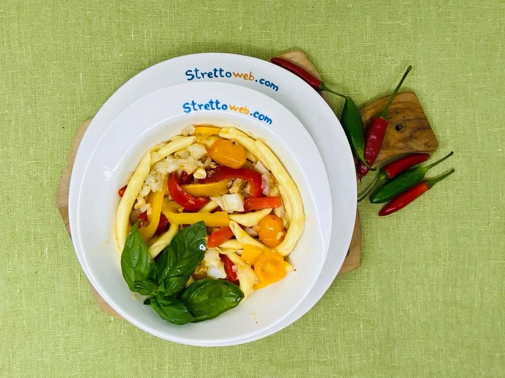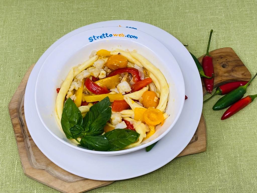 Un primo piatto estivo ma sostanzioso, questo, in cui la dolcezza dei peperoni e della cipolla si sposa perfettamente col baccalà. I fusilli calabresi al ferretto sono realizzati ancora oggi come in passato utilizzando farina e acqua, due soli ingredienti capaci di dar vita ad una pasta squisita.