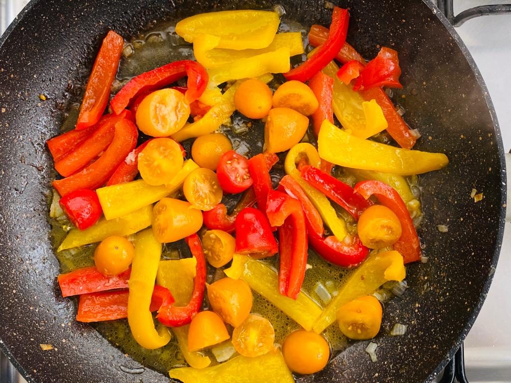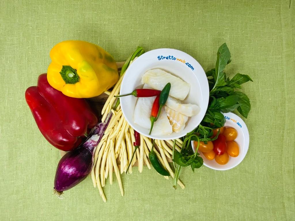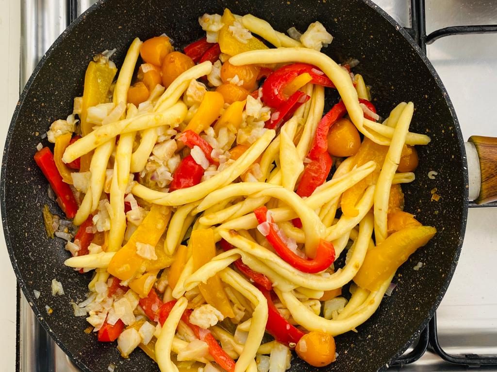 Iniziate a tritare la cipolla, tagliate a metà i pomodorini e a listarelle i peperoni. Fate rosolare la cipolla e aggiungete i tocchetti di baccalà facendoli cuocere per 5 minuti a fuoco alto. Al termine spostate il baccalà in una ampia ciotola e fate rosolare, nella stessa padella, i peperoni per 10 minuti aggiungendo un po’ d’acqua ed un pizzico di sale e, quasi a fine cottura, unite i pomodorini ai peperoni. Trasferite anche i peperoni ed i pomodorini insieme al baccalà e, dopo aver scolato la pasta, versatela su tutti gli ingredienti e amalgamate bene versando un filo d’olio. I fusilli calabresi con peperoni e baccalà sono pronti!