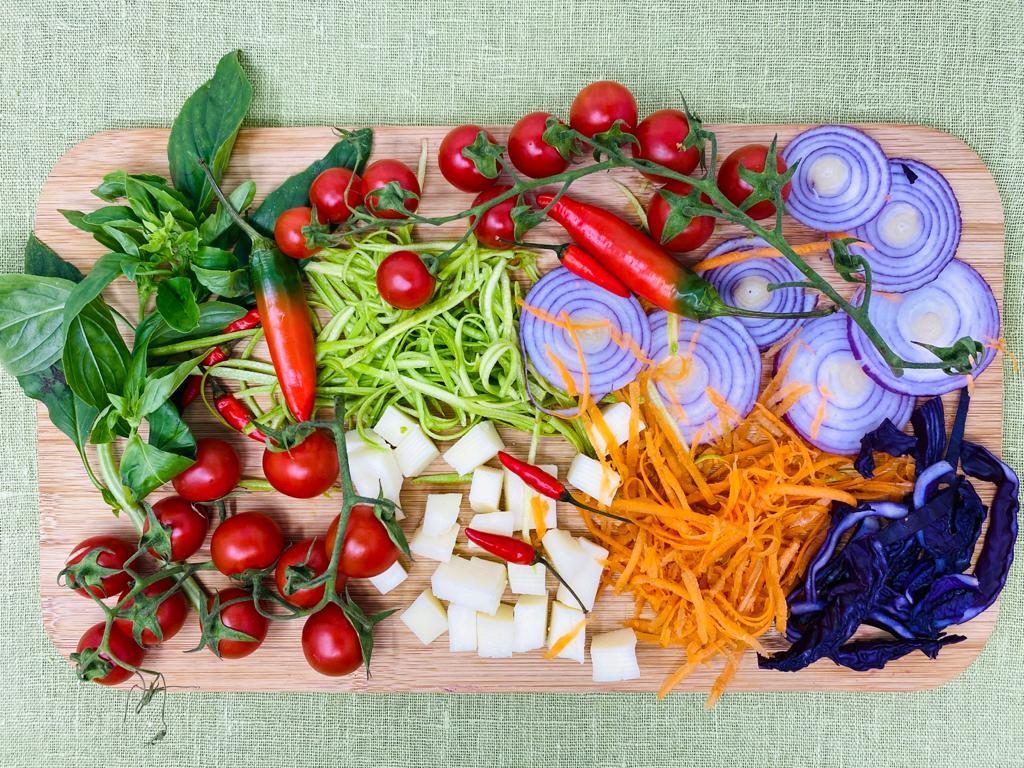 Lavate e asciugate i pomodorini e tagliateli in quarti. Pulite la cipolla, affettatela sottilmente e mettetela in ammollo in acqua fresca. Lavate e pulite carote e zucchine e tagliatele a julienne. Fate lo stesso per il cavolo rosso e tagliate a cubetti il pecorino. Unite i ceci e versate tutto in una grande ciotola per condire con olio, sale, pepe, origano e basilico.