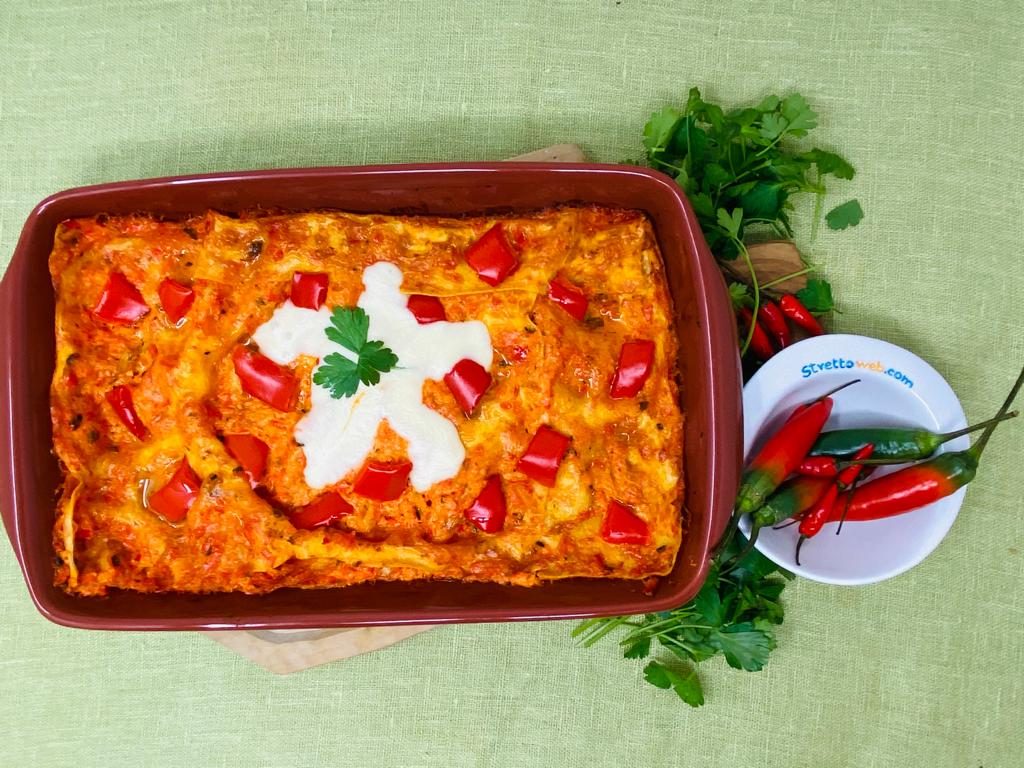 Queste lasagne con crema ai peperoni sono un piatto unico gustoso ed estivo. Con le verdure e gli ortaggi di stagione si realizzano delle paste al forno coerenti con la tradizione calabrese ma dai profumi e dai colori spiccatamente estivi.