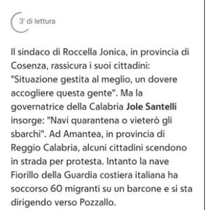 In un articolo pubblicato su Repubblica.it dal titolo “Calabria, proteste ad Amantea dopo l’arrivo di 13 dei 28 migranti positivi al coronavirus. Santelli: “Navi quarantena o blocco gli sbarchi”“, la giornalista Alessandra Ziniti, siciliana di Palermo, ha scritto queste sue frasi: “Il sindaco di Roccella Jonica, in provincia di Cosenza” e “Ad Amantea, in provincia di Reggio Calabria, alcuni cittadini scendono in strada per protesta“. Ora, va bene tutto, ma l’argomento è anche importante e delicato, dunque che cosa poteva costare ad una navigata collega fare una brevissima e veloce ricerca per scoprire che è esattamente il contrario? Ovvero che Amantea è una ridente località della provincia di Cosenza, sulla costa tirrenica, e invece Roccella è in provincia di Reggio Calabria, sulla costa ionica? I migranti in questione sono sbarcati e Roccella e alcuni di essi sono stati trasferiti tra Bova e Amantea, in due strutture attrezzate per altri accertamenti e, ovviamente, per la quarantena, visti i casi di positività.