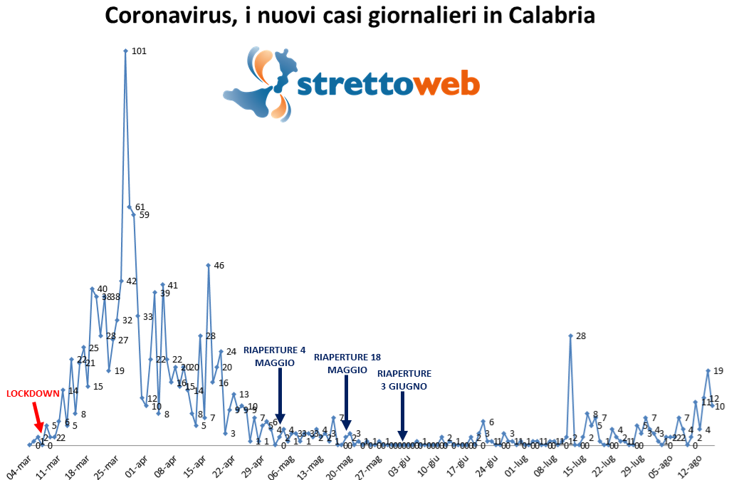 Ecco il grafico con l’andamento dei nuovi casi di contagio giornaliero in Calabria: