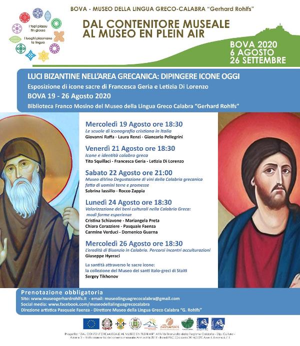 21 Agosto, sempre alle ore 18:30, l’incontro con le iconografe Francesca Geria, Letizia Di Lorenzo, le quali, oltre a presentare i lori lavori, ci accompagneranno nel tema centrale dell’evento espositivo, incentrato a sondare il ruolo della pittura neobizantina nella ridefinizione identitaria della minoranza linguistica dei Greci di Calabria. La mostra sarà inoltre arricchita da una degustazione di vini dell’area grecanica, curata dalla Sommelier Sabrina Iasillo, che Sabato 22 Agosto alle ore 21:00 accompagnerà gli ospiti in un viaggio sensoriale tra i vini dell’Aspromonte greco, prodotti delle seguenti aziende vinicole locali: Terre grecaniche, cantina Nesci, cantina Crupi Antonio, azienda vinicola Malaspina, cantina Nino Altomonte, Bruno Traclò, Regina Sant’Angelo, Nino Inuso. L’incontro, presieduto da Tilde Minasi, capogruppo della Lega nel consiglio Regionale della Calabria, ed organizzato grazie al supporto di AIAB Calabria, associazione italiana per l’Agricoltura biologica della Calabria, vedrà nel tavolo dei relatori il professore Rocco Zappia del Dipartimento di Agraria dell’Università degli Studi Mediterranea di Reggio Calabria, noto per le sue scrupolose ricerche sulla viticultura nella nostra regione, sui metodi di produzione e vinificazione nel basso jonio reggino. Lunedì 24 Agosto alle ore 18:30, la mostra di icone farà da cornice al seminario sulla valorizzazione dei beni culturali nella Calabria Greca, finalizzato per dare una ampia visibilità ad alcuni interessanti esperienze messe in atto in questi anni nella regione Calabria. Saranno presenti Cristina Schiavone, funzionario restauratore e conservatore della Soprintendenza ABAP per la Città metropolitana di Reggio Calabria e la Città di Vibo Valenzia, l’archeologa medievista Mariangela Preta, la conservatrice dei beni culturali Chiara Corazziere, ed ancora Carmine Verduci, Domenico Guarna, protagonisti di due interessanti interventi di promozione e valorizzazione del patrimonio culturale del territorio compreso tra l’area dello Stretto e la Locride. Gli appuntamenti compresi nell’ambito della mostra “Luci bizantine nell’area grecanica: dipingere icone oggi”, si concluderanno Mercoledì 26 Agosto alle ore 18:30, quando saranno ospiti l’archeologo medievista, Giuseppe Hyeraci, invitato a relazionare sugli aspetti culturali lasciati in eredità in Calabria nel corso della lunga dominazione bizantina e l’iconografo Sergej Tikhonov, che invece focalizzerà l’attenzione sulla sua personale esperienza nella realizzazione e l’allestimento del museo dei santi italo-greci di Staiti. Gli eventi culturali, curati dal direttore del Museo della Lingua Greco-Calabra Gerard Rohlfs, Pasquale Faenza, sono fruibili solo su prenotazione all’email museolinguagrecocalabra@gmail.com, al fine di rispettare le indicazioni dei provvedimenti vigenti in materia di contenimento e gestione dell’emergenza epidemiologica Covid-19.