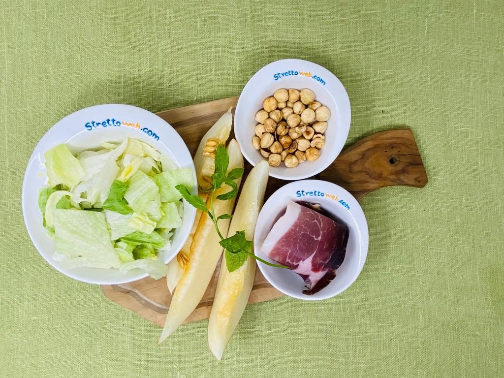 Lavate e tagliate a listarelle la lattuga iceberg, tagliate a cubetti lo speck e fate lo stesso per il melone giallo. Aggiungete le nocciole e condite tutto con olio, sale, pepe, aceto balsamico e decorate con la menta.