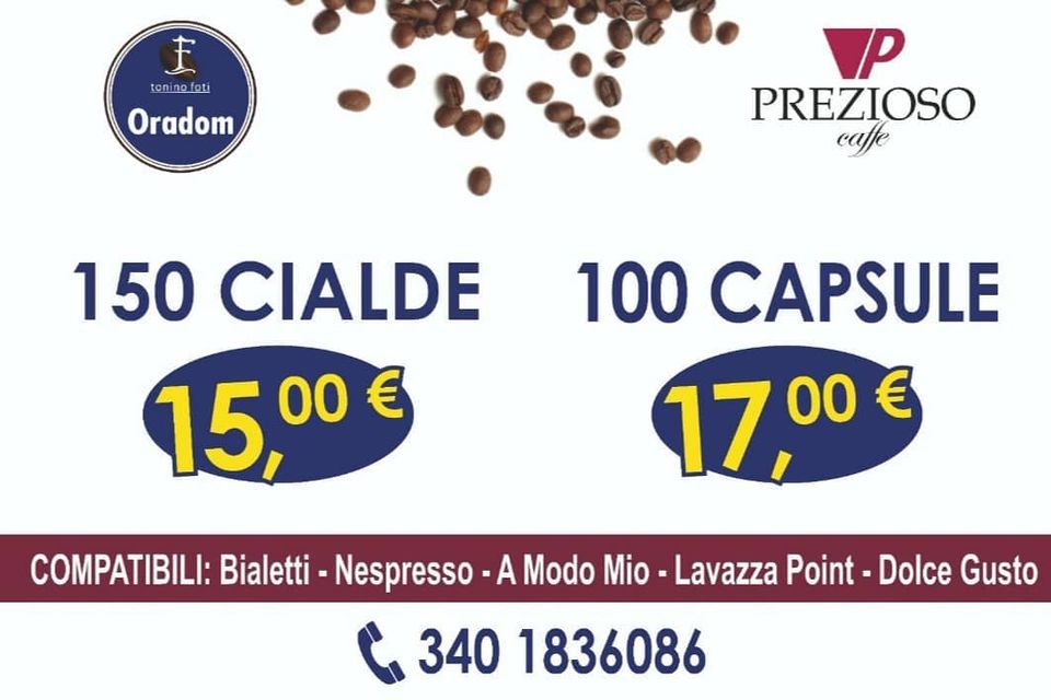 La pausa relax per un caffè è considerata un momento sacro nella giornata di ognuno di noi. E’ importante dunque gustare un buon prodotto per eliminare lo stress accumulato e godersi qualche attimo di estrema tranquillità. Grazie ad una fantastica promozione disponibile a Reggio Calabria e provincia e alla qualità del caffè si può far coincidere anche la possibilità del risparmio: con soli 15 € infatti è possibile acquistare 150 cialde, oppure con 17 € avere 100 capsule. Un’offerta da non perdere assolutamente, per l’ordine basta telefonare al 340.1836086. Possibilità di consegna a domicilio.