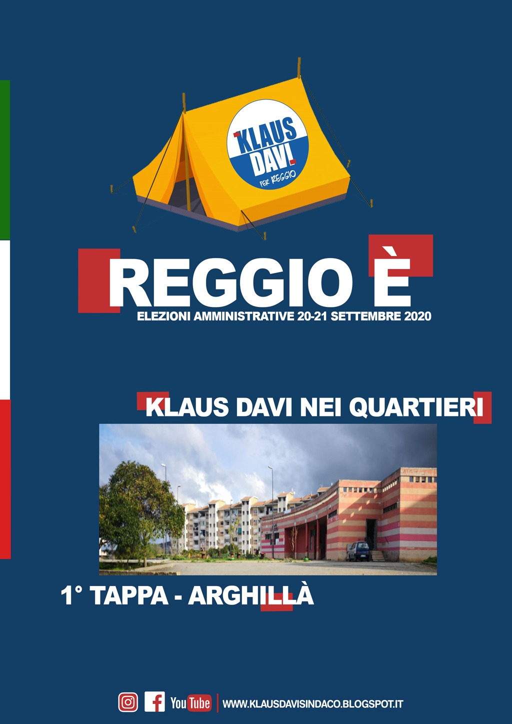 Chiusura shock per la campagna elettorale di Klaus Davi a capo di una Lista Civica di Reggio Calabria. Il massmediologo trascorrerà le ultime quattro notti prima del voto in una tenda brandizzata “Lista Klaus Davi per Reggio”. Prima tappa prevista sarà il quartiere Arghillà di Reggio Calabria considerato a torto e ingiustamente la “Scampia” della regione. Lo Scopo dell’operazione è anticipare quello che sarà lo stile del giornalista italo-svizzero qualora dovesse essere scelto come Sindaco. «Saremo dialoganti con le istituzioni che prenderanno in considerazione le esigenze e le emergenze della città mentre faremo azioni eclatanti ogni qualvolta. Il premier Conte ma anche Jole Santelli e i vari ministri competenti sul sud sono ‘avvisati”. La tenda di Klaus Davi si materializzerà ogni qualvolta non daranno concrete risposte sui dossier della città dei bronzi di Riace. Su Arghillà la Lista di Klaus Davi ha presentato nel proprio programma un articolato progetto di riqualificazione così come per il quartiere Archi (dove abita il massmediologo) e altre zone periferiche della città.