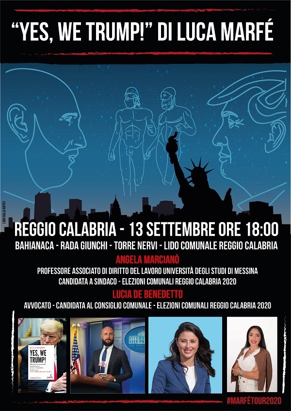 Si terrà domenica 13 settembre alle ore 18 nella splendida cornice del “Bahianaca” l’incontro-evento che vedrà sbarcare a Reggio Calabria il volto noto del giornalismo italiano negli USA, Luca Marfè, per sostenere la candidatura di Angela Marcianò a Sindaco della città dello Stretto. Il giornalista napoletano, esperto di politica, collaboratore de “il Mattino” e di “Vanity Fair”, nel corso del suo tour mondiale per la promozione del libro “Yes, We Trump!” ha deciso di far tappa in riva allo Stretto, approfondendo i temi del politically correct, ma senza usare il tipico linguaggio “politichese”, con la semplicità che contraddistingue tutti i meridionali. L’incontro è aperto al pubblico.