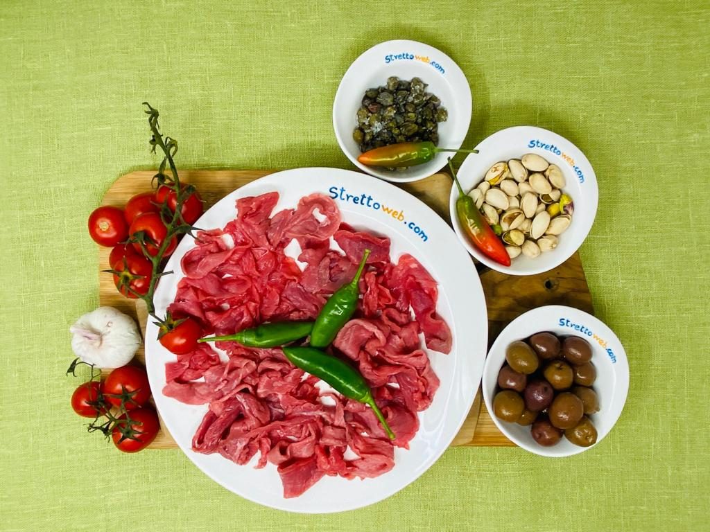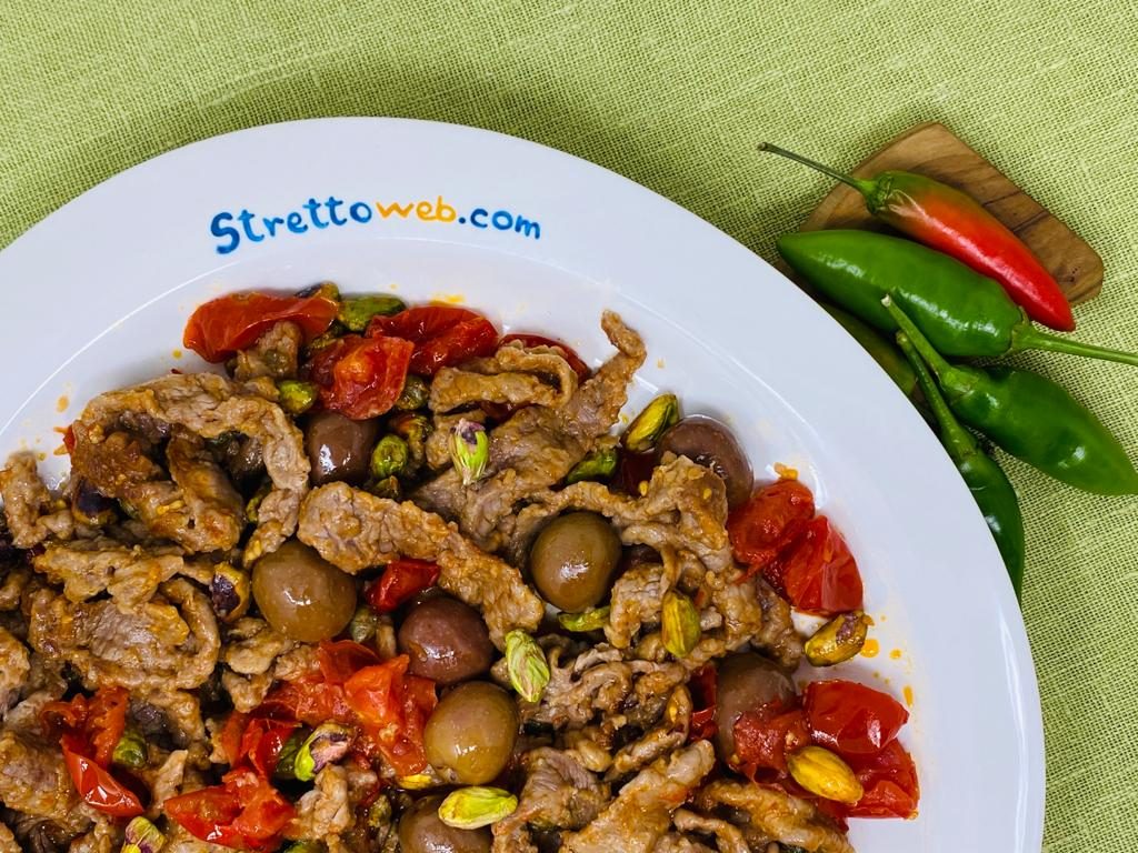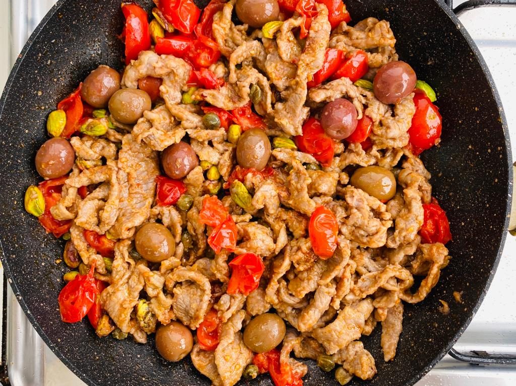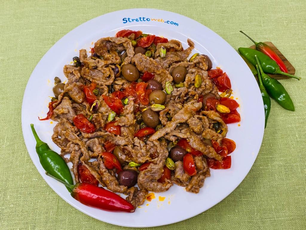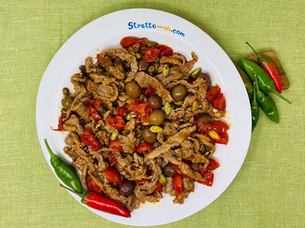 Infarinate gli straccetti e metteteli da parte; fate rosolare l’aglio in una grande padella, aggiungete i pomodorini tagliati in pezzi e fateli cuocere qualche minuto. Unite la carne e cuocetela a fiamma alta per 5 minuti. Salate e sfumate col vino bianco, aggiungete anche i capperi, le olive ed i pistacchi e continuate la cottura per altri 5 minuti mescolando velocemente la carne. Gli straccetti vanno serviti ben caldi.