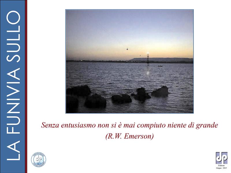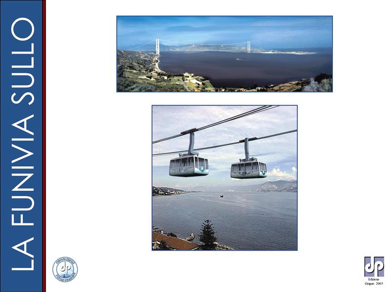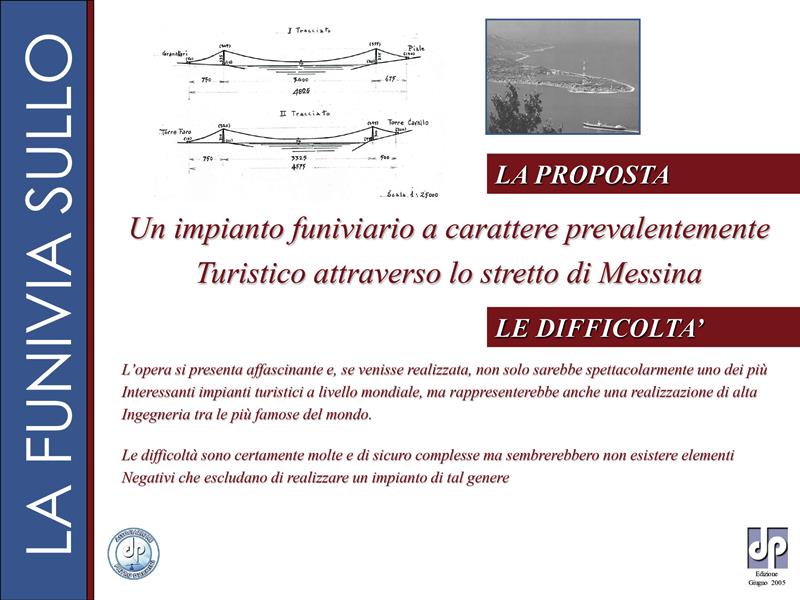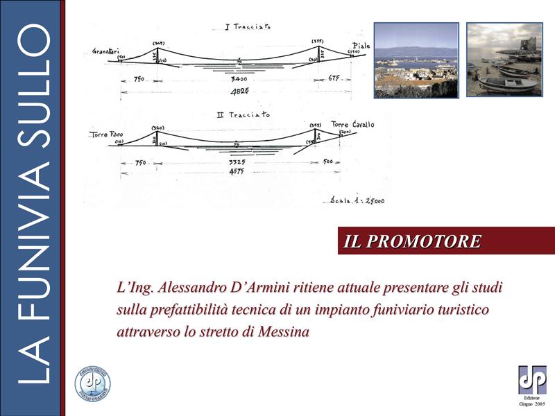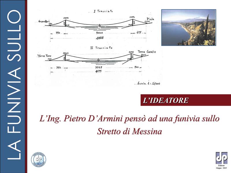 Una funivia dalla quale poter ammirare il panorama dello Stretto di Messina, la Costa Viola calabra e quella siciliana, uno spettacolo unico al mondo che avrebbe potuto attirare l’attenzione di visitatori da ogni parte del mondo. “Gli estremi del tracciato sarebbero posti nei pressi dell’abitato di Granatari in Sicilia e di Piale in Calabria, inoltre sarebbe costituito da una grande campata centrale di attraversamento (lunga circa 3400 mt), sostenuta agli estremi da due sostegni, alti 335 mt circa quello sulla sponda sicula e 325 mt quello sulla sponda calabrese, e da due campate laterali che permettono il raggiungimento della cima dei sostegni (750 mt in Sicilia e 675 mt in Calabria. Era questo il sogno di mio padre, che comunque all’epoca non pensava ancora al Ponte. Il mio unico merito – sottolinea Alessandro D’Armini – è stato quello di accorpare il progetto della funivia a quello del Ponte, perché andai io direttamente a parlare con le tre famosissime aziende, proponendogli di unire le due idee. Si tratta infatti di due costruzioni completamente diverse nelle loro funzioni: mentre il Ponte ha un sistema di trasporto ferroviario e stradale per gli spostamenti veloci, la funivia porta soltanto dei numeri limitati di persone che però hanno uno scopo turistico. La risposta delle aziende è stata sempre positiva, in quanto è possibile appoggiarsi ai piloni destro e sinistro, quello calabro e quello siciliano, facendoli diventare i traenti della funivia. Sarebbe un’opera di ingegneria unica al mondo. Noi abbiamo in Italia figure professionali di altissimo livello, perché non sfruttarle in modo concreto nel nostro territorio, piuttosto che mandarli ad operare soltanto in Olanda e in Danimarca?”.