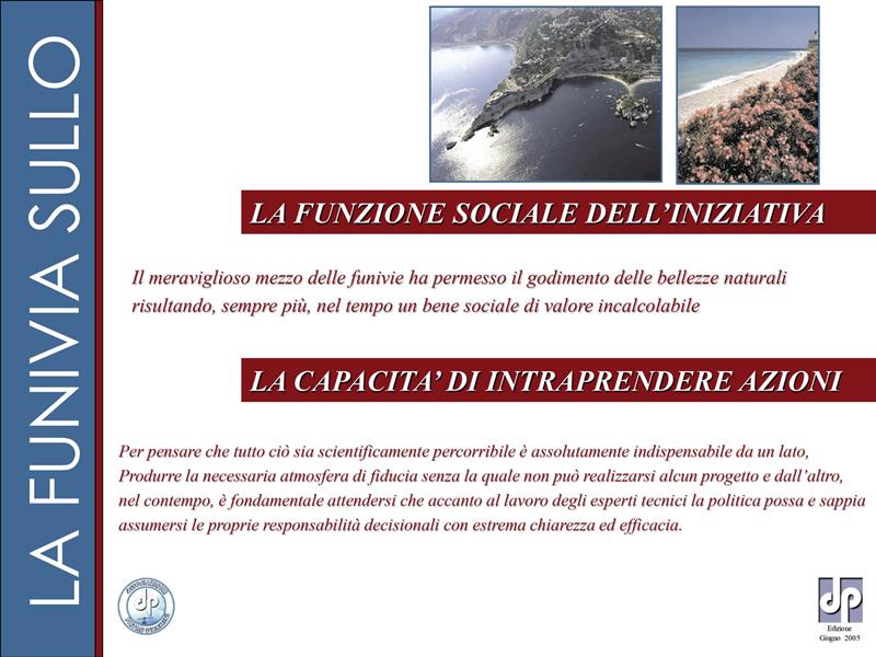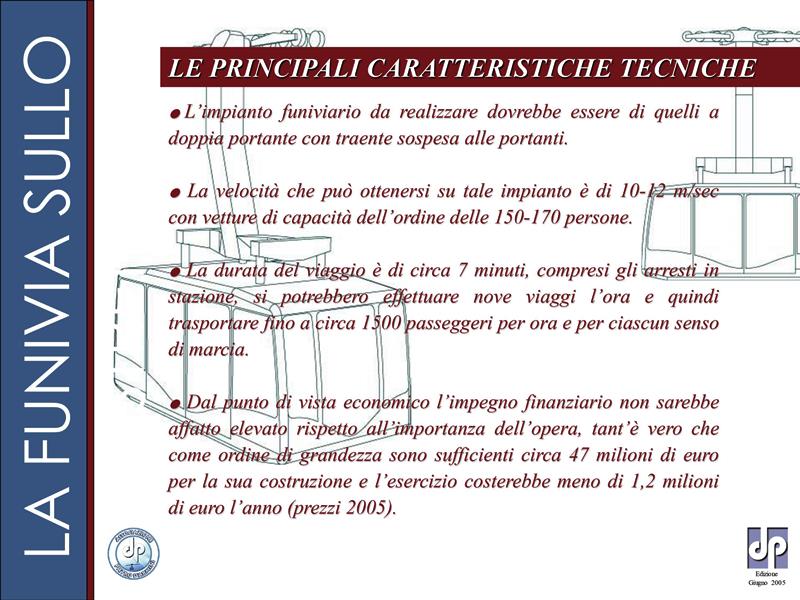Dalle premesse, D’Armini entra poi nel merito: “è normale che adesso il progetto andrebbe rimodulato, perché dalla sua ideazione sono passati troppi anni. Andrebbe rivisitato con le nuove tecnologie, però io all’epoca ereditai il materiale di mio padre ed affrontai l’argomento con esperti del settore che ho conosciuto e sono tuttora in vita, come ad esempio l’ingegner Achille Bonini. Parliamo di un luminare degli impianti a fune, che è perfettamente a conoscenza del progetto di mio padre. Inoltre ebbi l’approvazione anche di tre grosse imprese funiviare di livello mondiale: LEITNER, Doppelmayr e Poma Italia, che oggi non esiste più ma è stata accorpata alla Doppelmayr”. Queste imprese hanno creato sempre funivie in montagna, ma tranne in rari casi (come ad esempio a Barcellona) nessuno ha mai costruito funivie che vanno in orizzontale e non in verticale. “Mi feci dimostrare con carte e calcoli alla mano – continua D’Armini – che la funivia orizzontale ha la stessa funzione e si avvale delle stesse considerazioni. Quindi anche sullo Stretto di Messina, con lo studio dei venti e delle correnti, era un discorso che si poteva fare. Si iniziò a parlare dunque di funivia turistica, perché ovviamente questo è un tipo di trasporto che non è adatto agli spostamenti di massa, che comunque avrebbe potuto dare un grande impatto a livello internazionale”.