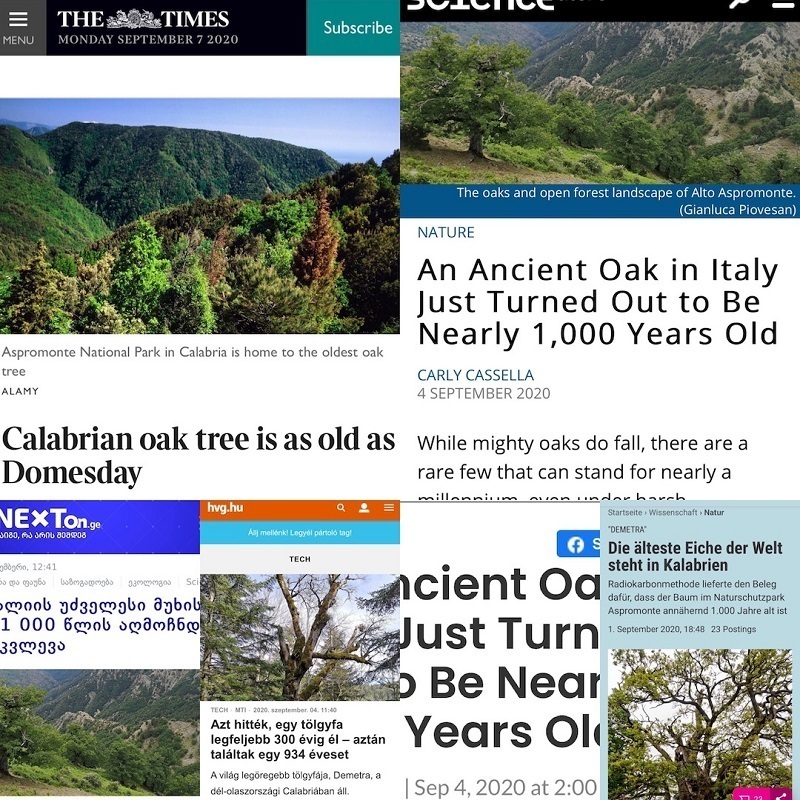 Lo storico e prestigioso quotidiano londinese “The Times” ha dedicato alla notizia un doppio articolo sull’edizione cartacea e su quella online. “La Quercia più antica del Mondo è in Calabria” titola Der Standard, quotidiano austriaco con sede a Vienna tra i più letti della Nazione; spazio alla scoperta di Demetra anche nella sezione ambiente del “The world news monitor”, diffusissimo portale online di rifermento mondiale, mentre il giornale Sciencealert, nel trattare la scoperta spiega che “alcuni alberi possono resistere per quasi un millennio, anche in condizioni difficili, come è successo per Demetra in Aspromonte, in Calabria”. Tra le riviste più conosciute in Ungheria c’è Hvg che, relativamente allo studio dell’Università della Tuscia, “La quercia più antica del mondo, Demetra, si trova in Calabria, nel sud Italia”. La notizia, ancora, tra gli altri, è stata ripresa anche dal quotidiano georgiano next.on.ge. Il valore della notizia, l’importanza della scoperta a seguito dei certosini ed appassionati studi, hanno coinvolto i giornali internazionali consapevoli di quanto sia importante la scoperta per il mondo scientifico ed accademico ma soprattutto per l’ambiente, gli ecosistemi e la natura.