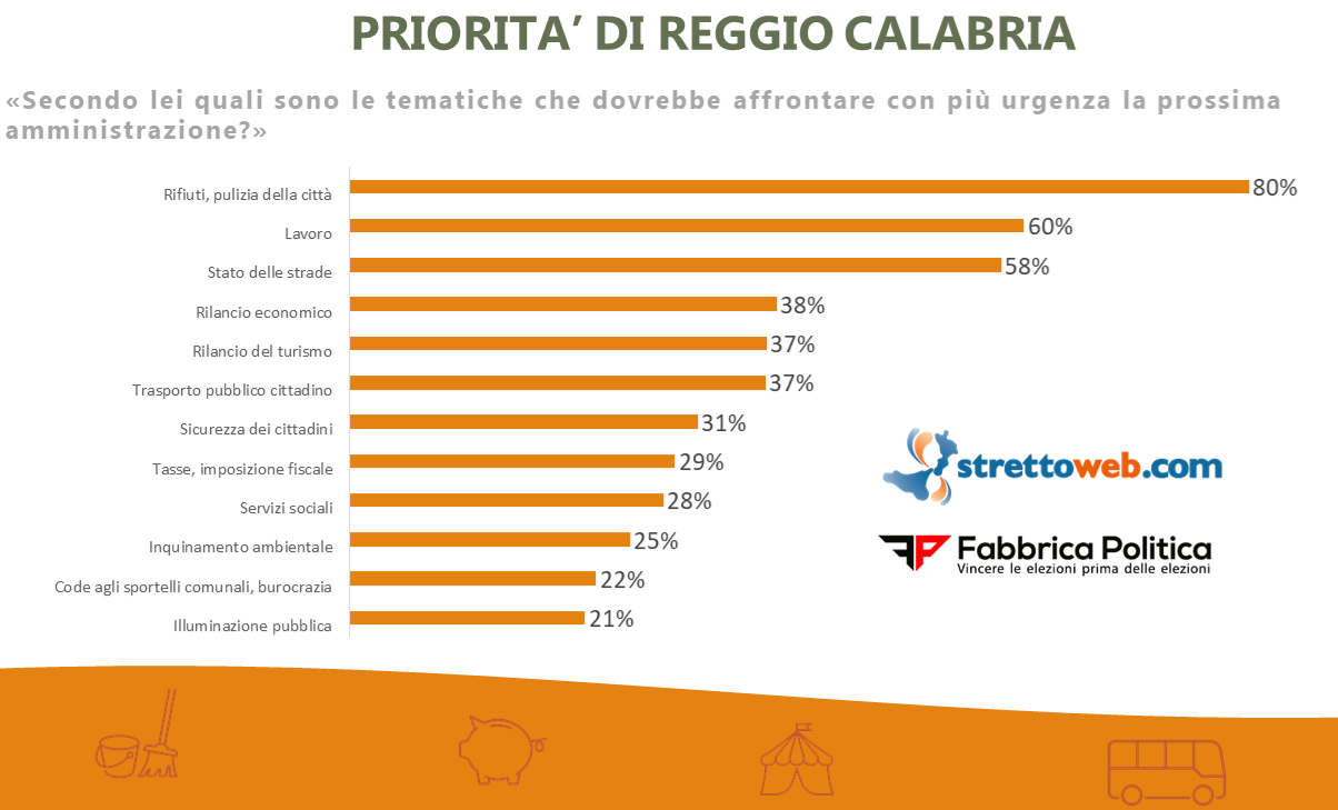 Quali sono le tematiche che dovrebbe affrontare con più urgenza la prossima amministrazione comunale? L’emergenza rifiuti condiziona fortemente l’opinione pubblica reggina in vista delle elezioni comunali di Reggio Calabria, come emerge dal sondaggio realizzato da Fabbrica Politica per StrettoWeb: la questione rifiuti, con il decoro e la pulizia della città, è di gran lunga la più sentita dagli elettori che la considerano assolutamente prioritaria.