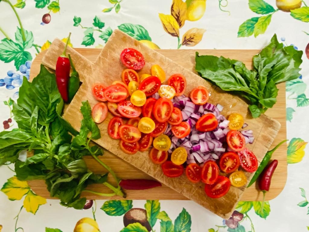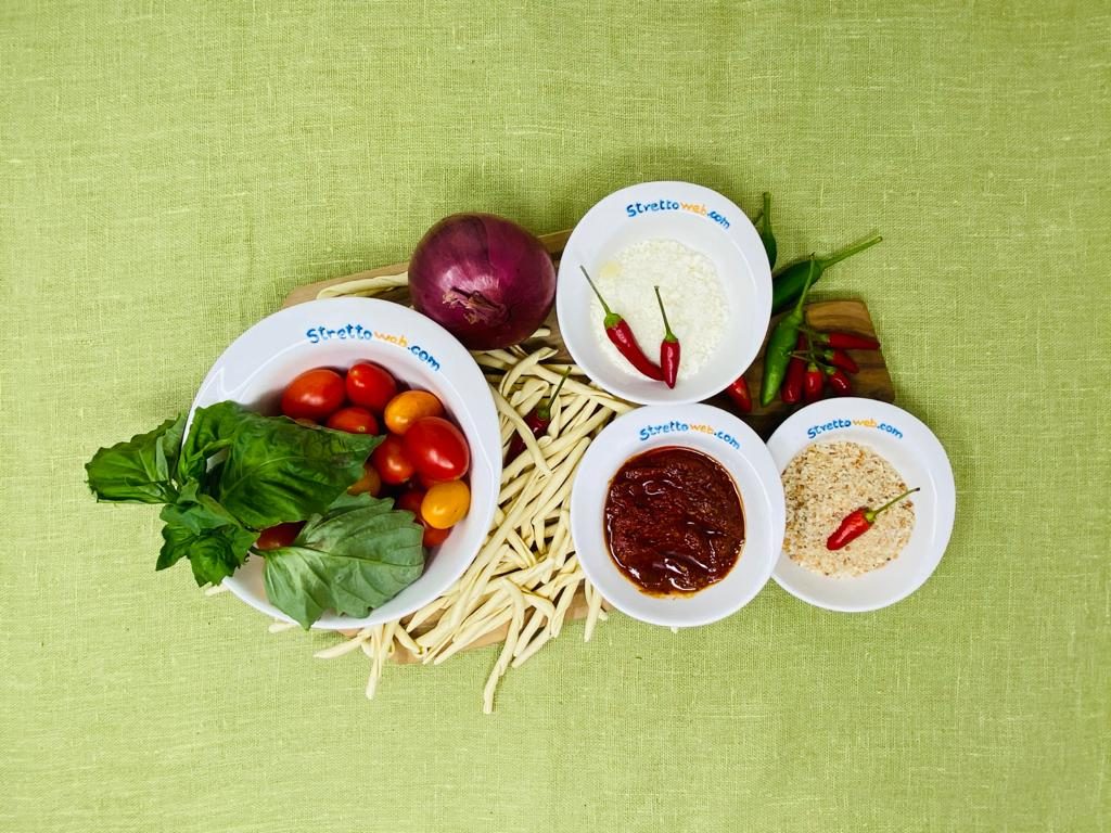 Fate rosolare la cipolla tagliata sottile in olio extravergine di oliva e, subito dopo, sciogliete nell’olio la ‘nduja e aggiungete i pomodorini tagliati a metà. Cuocete a fiamma alta per circa 10 minuti e quando i pomodorini si ammorbidiscono unite la mollica e fatela diventare croccante. Adesso cuocete la pasta in abbondante acqua salata e, appena pronta, scolatela e fatela saltare in padella con i pomodorini e la ‘nduja. Una spolverata di pecorino ed il basilico fresco completano questo piatto saporito!