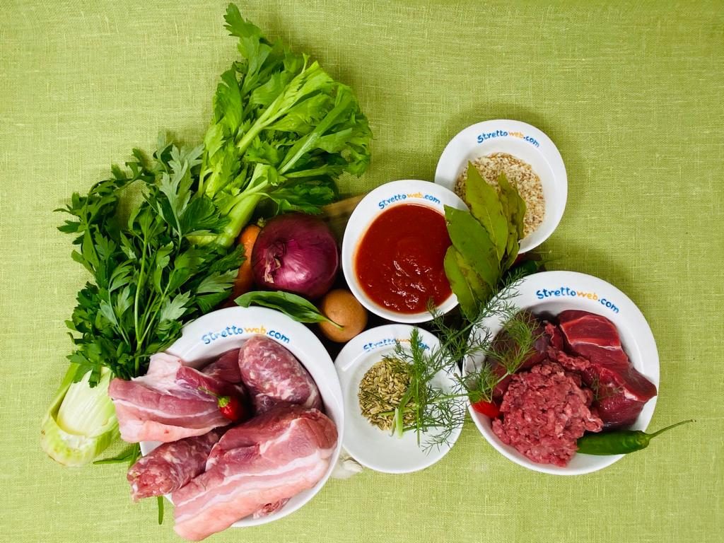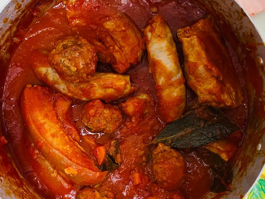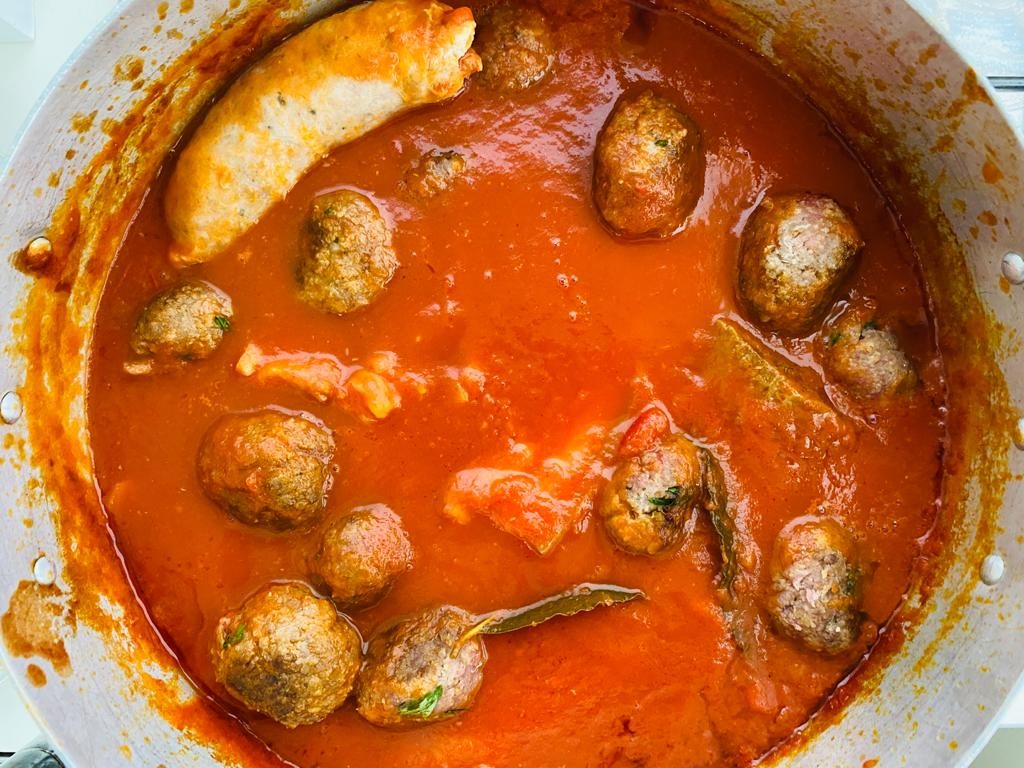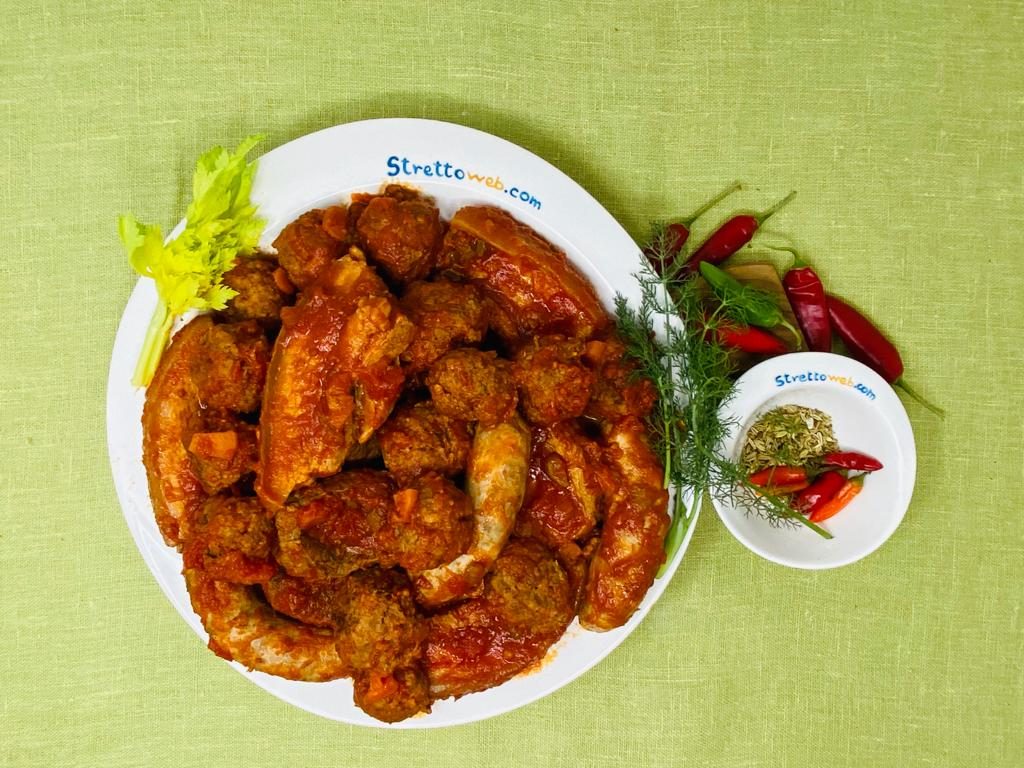 Iniziate a preparare le polpette: in una ciotola mettete la carne macinata, il pangrattato, il formaggio, l’uovo, l’aglio ed il prezzemolo tritati e, per finire, sale e pepe. Impastate e, con le mani inumidite, formate le polpette, passatele in padella con un filo d’olio per pochi minuti e mettetele da parte. Adesso tritate sedano carote e cipolla e fateli rosolare con olio extravergine per un paio di minuti in una pentola capiente. Unite la carne di vitello e di maiale, fatela soffriggere per pochi minuti e sfumatela col vino rosso. Aggiungete la passata di pomodoro, il finocchietto, l’alloro, il sale ed un pizzico di pepe. Cuocete tutto per un’ora circa a fuoco moderato e, nel frattempo, fate sbollentare la salsiccia ed eliminate l’acqua. Unite al sugo la salsiccia e le polpette e proseguite la cottura per un’ora finchè la carne non risulterà morbida.