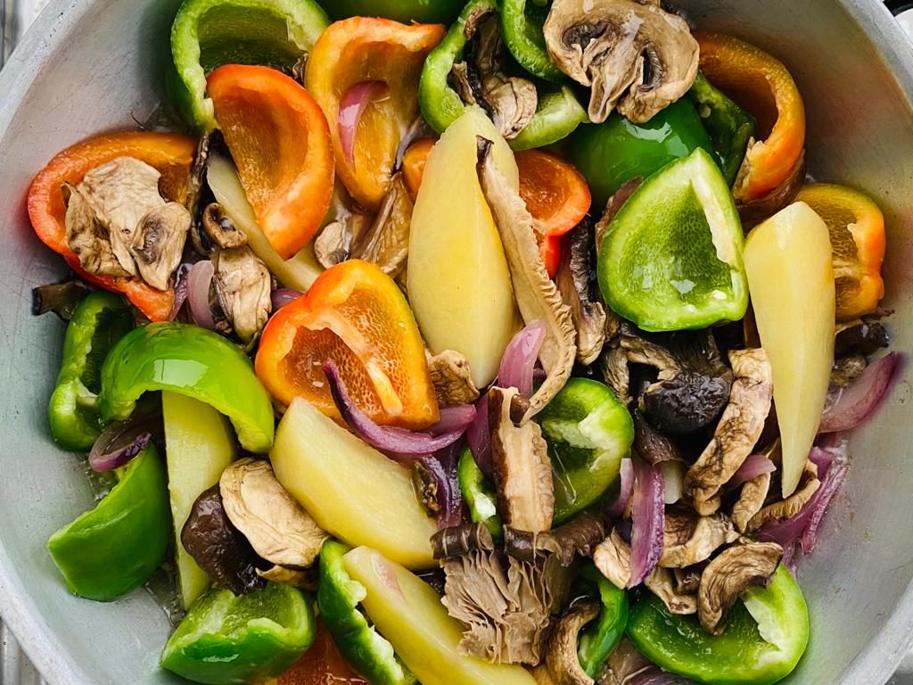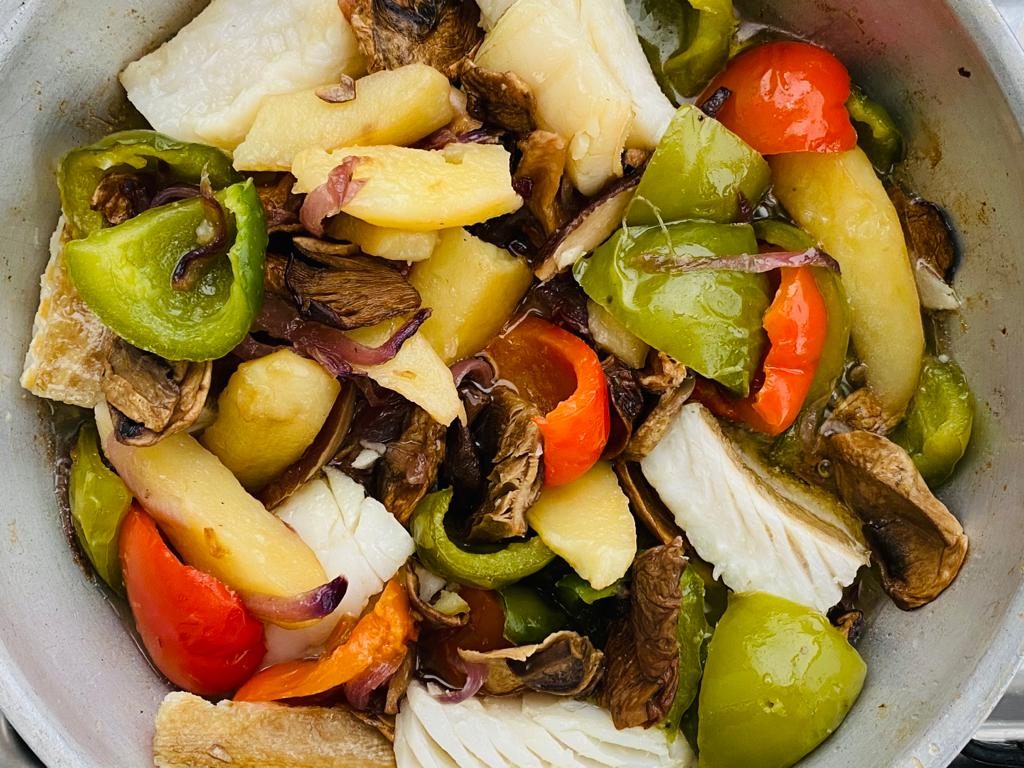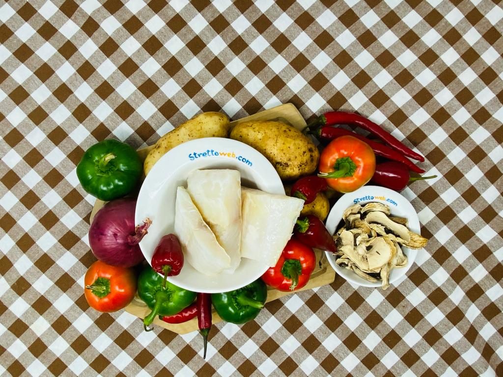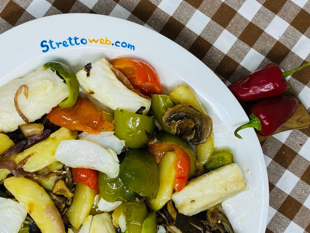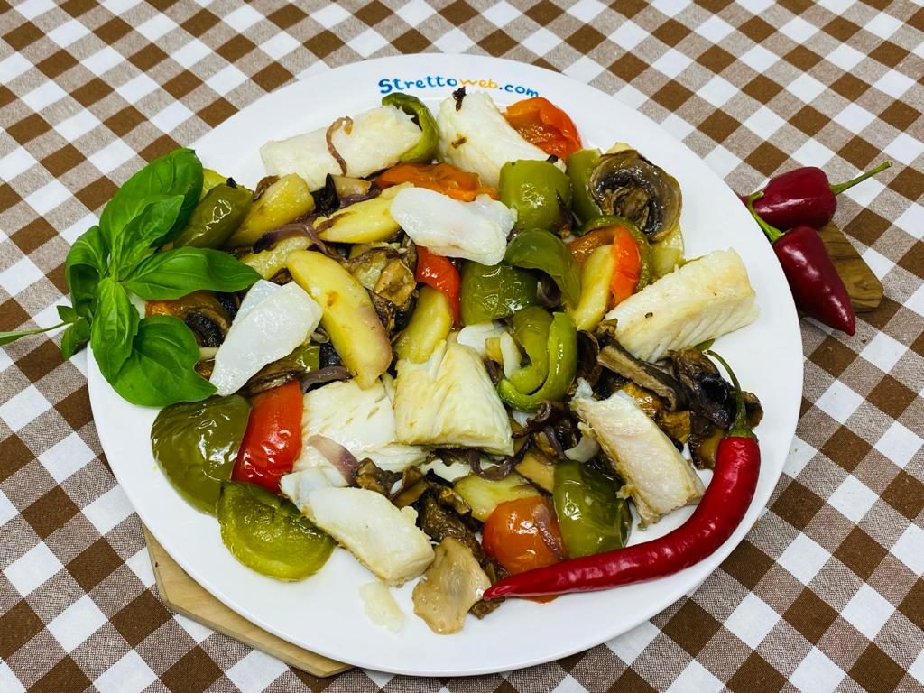 Mettete in ammollo in acqua calda i porcini secchi per 20 minuti e, nel frattempo, sbucciate le patate, pulite i peperoni e tagliateli entrambi a spicchi. Affettate la cipolla e fatela rosolare in una padella con olio extravergine di oliva, unite i peperoni, le patate ed i funghi, dopo averli strizzati. Aggiungete abbondante olio d’oliva, un pizzico di sale e di peperoncino e cuocete per 15-20 minuti. Per finire unite lo stocco e fatelo cuocere insieme agli altri ingredienti per circa 10 minuti. Completate il piatto con foglie di basilico fresco.