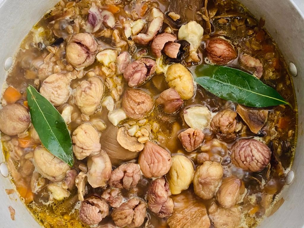 La zuppa di farro con castagne e funghi porcini è un primo piatto autunnale ricco di gusto che unisce la prelibatezza dei porcini alla dolcezza delle castagne. Antico cereale leggero ma nutriente, il farro racchiude vitamine, proteine e sali minerali ed è perfetto nelle zuppe e nelle minestre con i legumi.