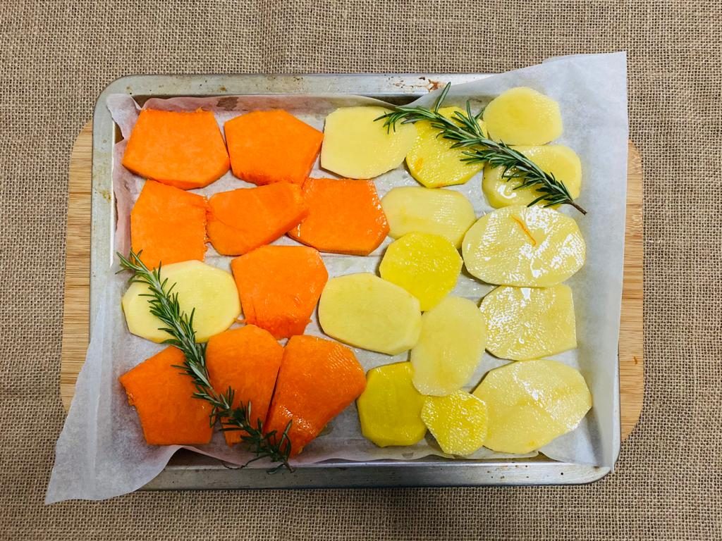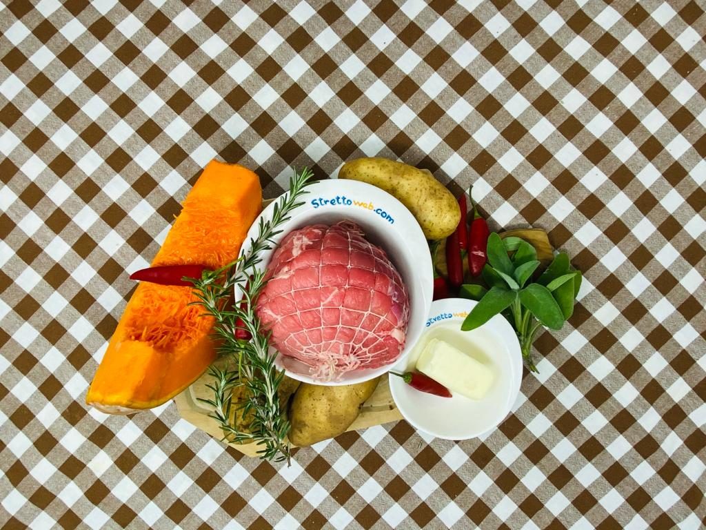 Fate rosolare la carne (già legata con lo spago dal vostro macellaio) a fiamma alta con burro e olio. Appena si sarà colorita uniformemente sfumatela col vino bianco, unite il brodo vegetale caldo, il rosmarino e la salvia, un pizzico di sale e di pepe e copritela facendola cuocere a fuoco basso per 1 ora circa. Aggiungete del brodo e ricordate di girarla spesso. Nel frattempo, affettate le patate e la zucca, oleatele bene e disponetele su una teglia da forno. Infornate le verdure a 180 gradi per 20 minuti e completate la cottura con 10 minuti al grill. Unite l’arrosto al contorno di zucca e patate e servite.