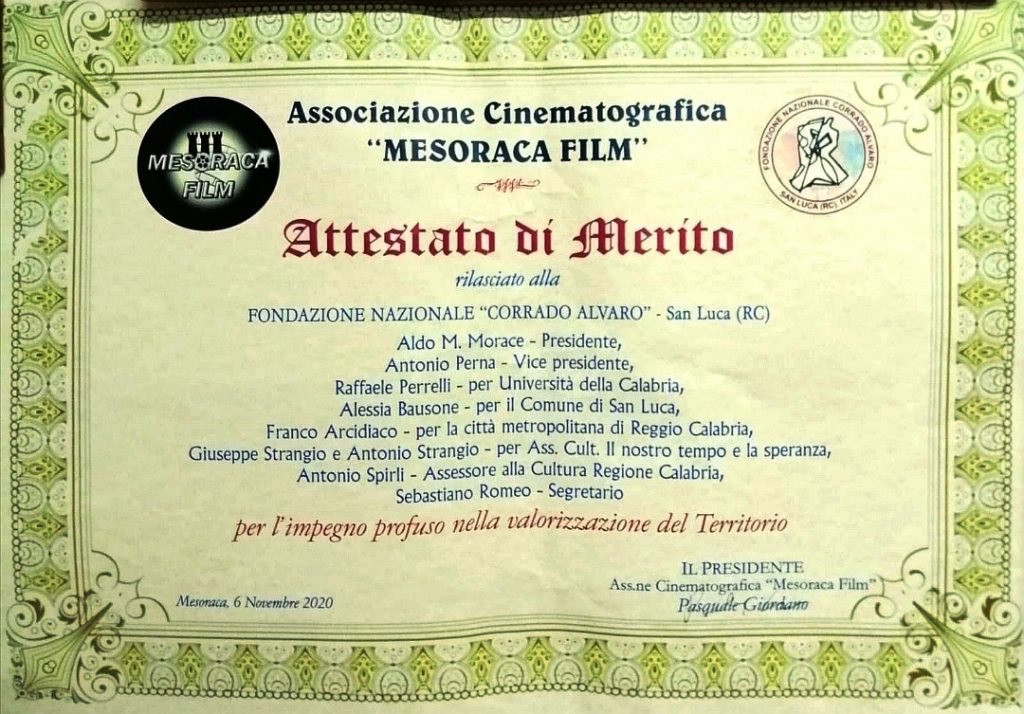 Bellissimo riconoscimento conferito dall’associazione cinematografica di Mesoraca “Mesoraca Film” alla rinomata “Fondazione Corrado Alvaro” di San Luca. Il motivo di questo riconoscimento è per l’impegno profuso nella valorizzazione del territorio, grande stima e ammirazione c’è tra le due realtà. Il regista Pasquale Giordano presidente della Mesoraca Film si congratula con tutti i componenti per la grande determinazione nel portare ad alti livelli la Calabria. La fondazione nasce il 24 gennaio del 1997, è retta da un consiglio di amministrazione composto dagli enti fondatori con un proprio rappresentante, regione Calabria ass. cultura, provincia di Reggio Calabria ass. cultura, università della Calabria col preside della facoltà di lettere e filosofia, comune di San Luca con il sindaco e l’associazione culturale “Nostro tempo e la speranza”. Sempre nell’anno di nascita viene inaugurato dal ass alla cultura della regione Calabria Antonella Freno, la casa museo di Alvaro donata al comune da Don Massimo Alvaro fratello dello scrittore. Tantissime attività importanti sono state svolte dalla fondazione dalla sua nascita, tra cui l’autorizzazione di apporre una targa di Corrado Alvaro al palazzo dove abitava a Roma e la targa viene scoperta alla presenza dell allora ass. alla cultura del comune di Roma Gianni Borgna è del viceministro degli interni Marco Minniti. Nel 2014 viene intitolata a Corrado Alvaro una sala polivalente voluta fortemente dal direttore della Rai per la Calabria ing. Demetrio Crucitti. La fondazione ha all’attivo XIII edizioni del premio letterario nazionale Corrado Alvaro.