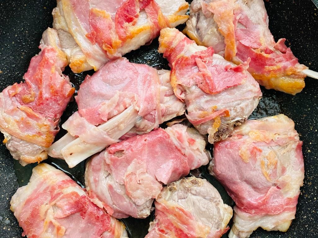 Dopo aver sciacquato ed asciugato le costolette, avvolgetele con le fette di pancetta. Rosolate l’aglio con due cucchiai di olio in una teglia, se possibile adatta anche al forno, e unite le costolette di agnello. Fatele colorare a fiamma alta finchè la pancetta non sarà croccante. Adesso aggiungete sale, pepe, salvia e rosmarino e bagnatele col succo di bergamotto prima di infornarle a 200 gradi per 30 minuti circa.